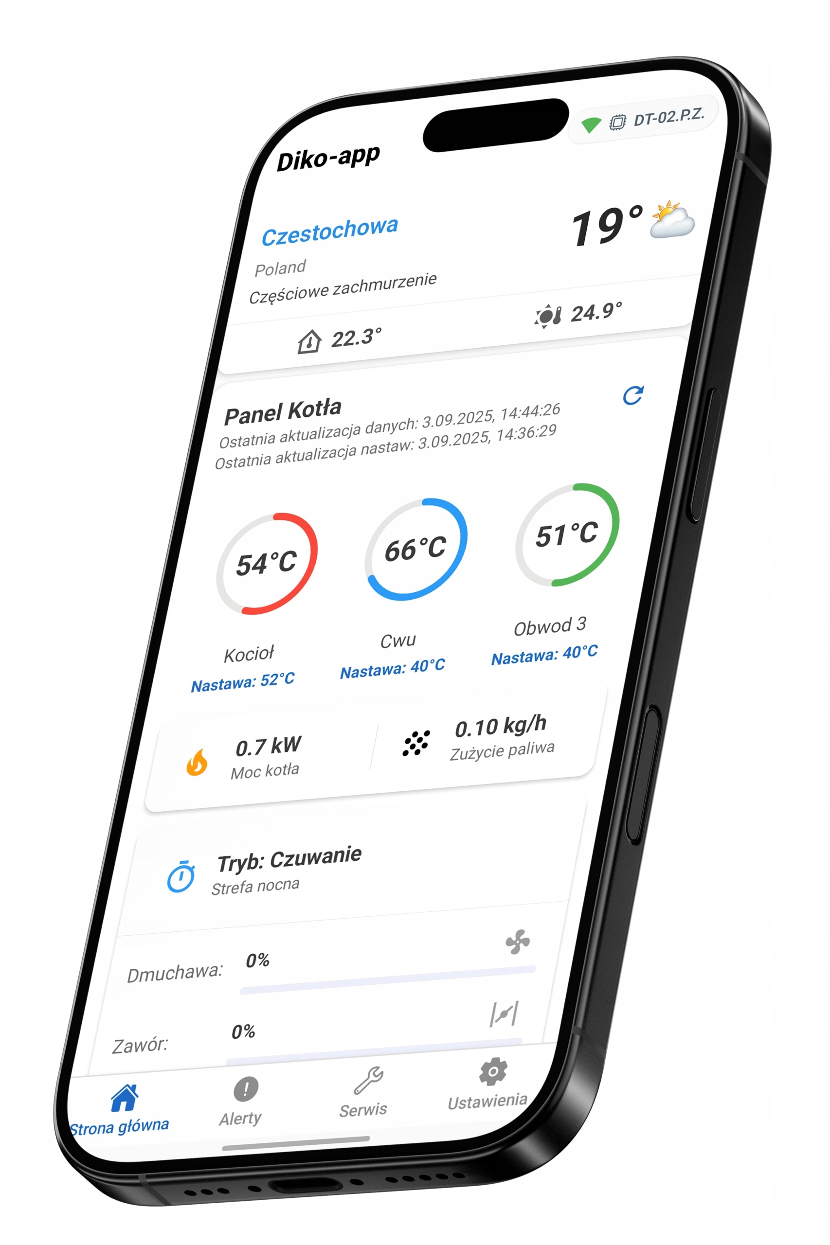 Контролер DT-02-це не лише пульт дистанційного керування, це всебічна система моніторингу та інтелектуальної попередження, яка дбає про ваш комфорт та безпеку 24 години на день. Завдяки інтуїтивному мобільному додатку Diko-App для Android та iOS ви отримуєте повне розуміння роботи котла та здатність негайно реагувати.