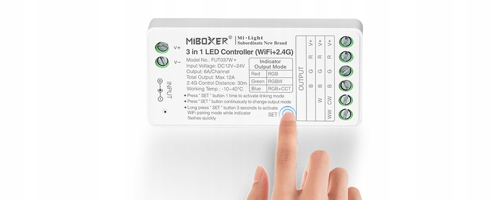 Світлодіодний контролер 3в1 (WiFi/Bluetooth) - RGB / RGB+W / RGB+CCT - 12-24V 12A - Tuya - FUT037W+, це невеликий пристрій, який використовується для керування різнокольоровим світлодіодним освітленням. Пристрій розроблено таким чином, що дозволяє змінювати інтенсивність яскравості, колірну температуру CCT або колір RGB за допомогою технології WiFi або Bluetooth, а підключене джерело світла контролюється через мобільний додаток. Зв'язок такого пристрою також досягається через радіо, за допомогою якого приймач зв'язується з передавальним пристроєм. Ви також можете отримати доступ до приймача за допомогою голосових систем Amazon Alexa або Google Home. Він також працює з додатком Tuya. Цей приймач працює з пристроями серії Mi-light.