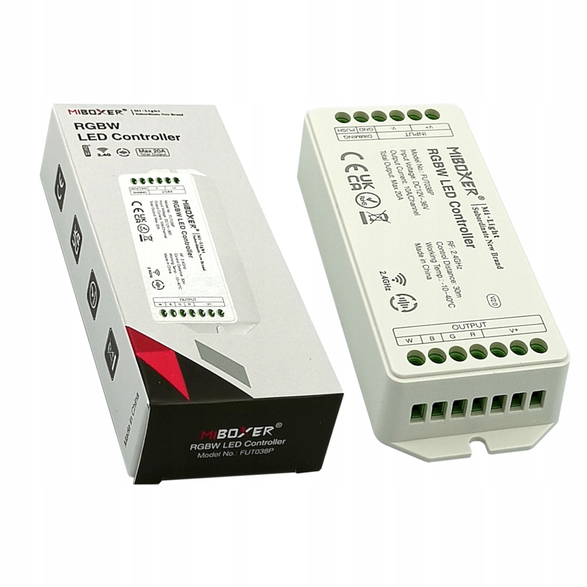 новітній зонний контролер Miboxer MiLight FUT038P, призначений для управління світлодіодними стрічками RGBW. Напруга живлення контролера - DC 12-36V, максимальний струм - 20A. Контролер оснащений, серед іншого: з функцією автоматичної передачі сигналу, можливістю голосового керування після використання роутера WL-Box1, можливістю зміни частоти ШІМ і функцією Не турбувати', корисною при частих відключеннях електроенергії (більше можна на вкладці «Додаткова інформація»)