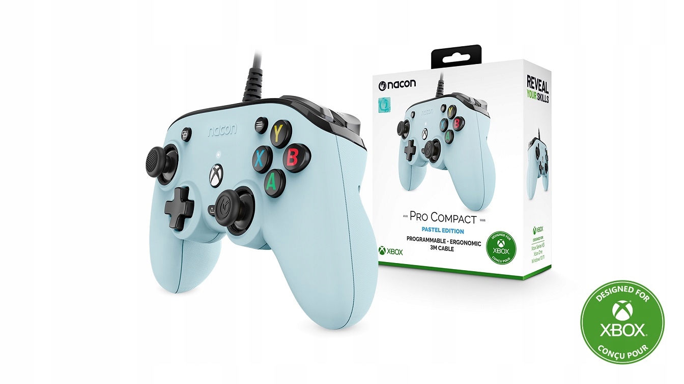 Контролер управління дротями Nacon - це альтернативний варіант для гравців, які хочуть максимального комфорту навіть під час тривалої гри, і в той же час не хочуть нічого зменшувати з точки зору вимог щодо продуктивності. Ергономічний дизайн та ряд варіантів, які широко видно лише у контролерів професійного рівня, відповідають цим гравцям Pro Compact. На додаток до того, що контролер пропонує стандартні функції класичного бездротового контролера Xbox, його супровідний додаток, доступний у магазині Microsoft Store, забезпечує розширені налаштування для створення власного ігрового профілю. Крім того, контролер може бути активований для безкоштовної технології просторової звукової технології Dolby Atmos® для навушників у додатку Dolby Access.