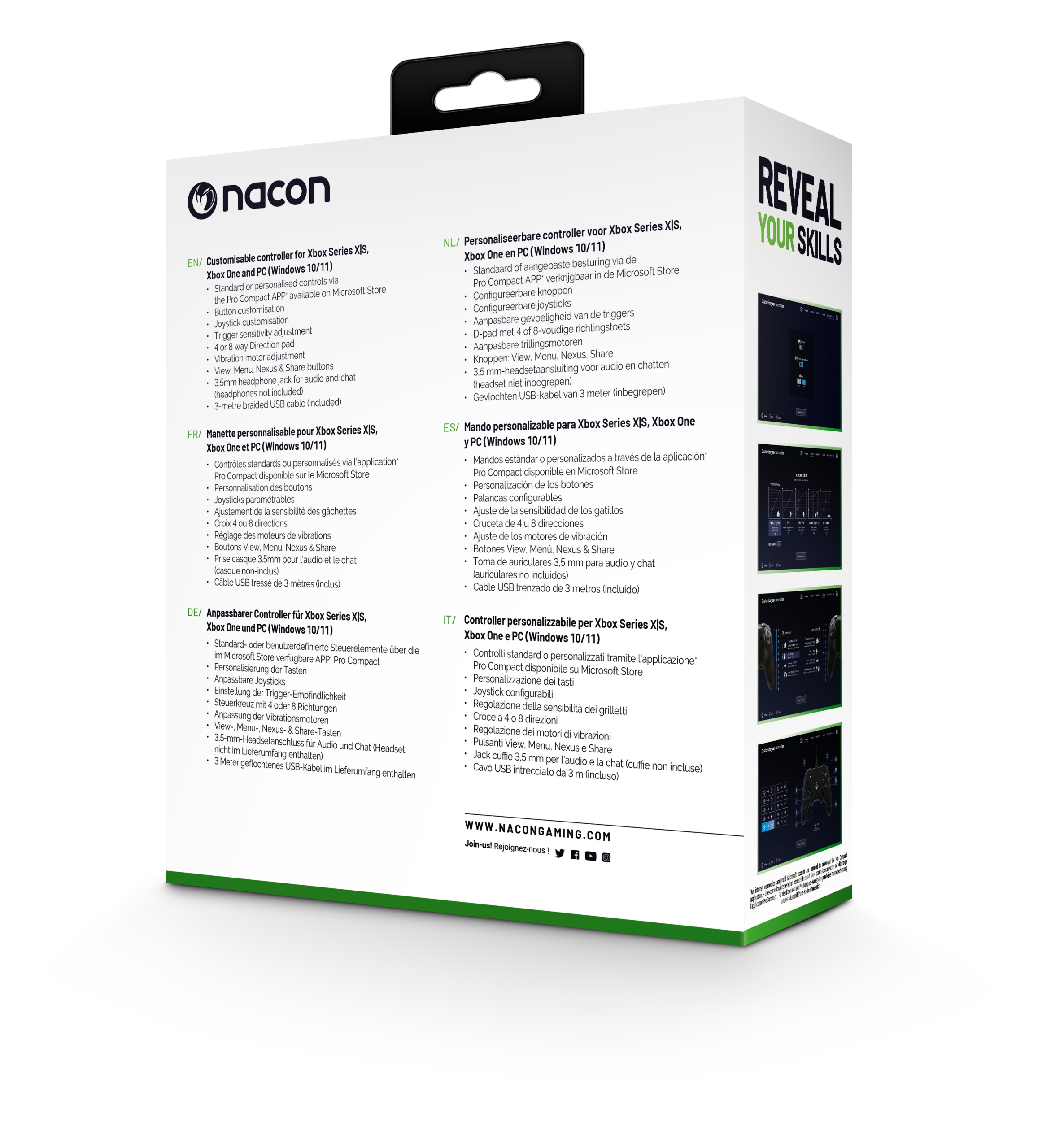 Контролер управління дротями Nacon - це альтернативний варіант для гравців, які хочуть максимального комфорту навіть під час тривалої гри, і в той же час не хочуть нічого зменшувати з точки зору вимог щодо продуктивності. Ергономічний дизайн та ряд варіантів, які широко видно лише у контролерів професійного рівня, відповідають цим гравцям Pro Compact. На додаток до того, що контролер пропонує стандартні функції класичного бездротового контролера Xbox, його супровідний додаток, доступний у магазині Microsoft Store, забезпечує розширені налаштування для створення власного ігрового профілю. Крім того, контролер може бути активований для безкоштовної технології просторової звукової технології Dolby Atmos® для навушників у додатку Dolby Access.
