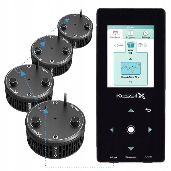 Інтуїтивно зрозумілий Kessil® Spectral Controller X із методом зв’язку K-Link для всіх світлодіодних пристроїв Kessil® A360X і всіх ламп Kessil 0–10 В має точне сенсорне керування та яскравий кольоровий дисплей. Spectral Controller X пропонує легке керування світлом одним дотиком пальця. Просто запрограмовані функції керування світлом надають необмежені можливості для безпомилкового налаштування.