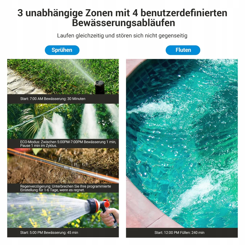 【Водонепроникний і герметичний】Контролер поливу підтримує стандартний кран 3/4 для зовнішнього використання та запобігає витоку води під час використання. Завдяки покриттю з ABS пластику таймер стійкий до сонячних променів і води. Сам шланговий таймер тиску не створює. Його максимальний збалансований тиск води становить 120 psi. Водопровідна вода або джерело води під тиском забезпечує нормальний дренаж 【Легке керування】Великий і зрозумілий 3,4-дюймовий РК-дисплей показує деталі всіх функцій. Пояснювальний текст ліворуч і миготливий курсор на екрані вказують на стан. 5 кнопок програмування можуть допомогти вам досягти різних циклів поливу, як і налаштування цифровий годинник 【3 незалежні виходи зрошення】 Система зрошення керується кнопками керування, щоб досягти різного зрошення та не заважати один одному, ідеально підходить для поливу газонів, овочів, таких як помідори та огірки, та інших рослин. Ви можете запрограмувати різні потреби з різними шлангами та налаштуваннями в один день, заощаджуючи енергію 【Користувацький час поливу】 Ви можете вибрати будь-який час поливу. Кожен день або кілька днів на тиждень, кожні 2 дні або кожні 3 дні, час початку, час поливу (1-240 хв). Контролер поливу постачається з кількома водяними шлангами, щоб задовольнити потреби в поливі всієї вашої родини за допомогою таймера 【Режим повторного поливу】Інноваційний дизайн. Таймер води вмикається і вимикається між запланованим періодом у циклі, наприклад, 15:00 – 20:00, УВІМКНЕННЯ на 5 хвилин, ВИМКНЕННЯ на 15 хвилин. Повторюється до іншого режиму. Ця гнучка конструкція може задовольнити ваші особливі потреби в певних умовах, наприклад, спринклери для газону або садові горщики на ранній стадії росту 【Затримка подачі води та режим ручного поливу】Якщо за прогнозом погоди йде дощ, увімкніть режим затримки дощу, щоб уникнути надмірного поливу. Режим ручного поливу пропонує унікальні функції для екстрених потреб. Ви можете повернутися до попереднього автоматичного режиму без нового програмування 【 Відпочинок у спокої 】 2 батареї 1,5 В типу АА (не входять в комплект), індикатор низького заряду батареї. Якщо ви перебуваєте у відпустці, і акумулятор розряджений, одного разу під час відпустки поза домом ви забудете замінити акумулятор, стан буде вимкнено, щоб уникнути потрапляння води та заощадити воду. Після відновлення живлення необхідно встановити поточні налаштування часу, попередні плани поливу залишаються в силі.
