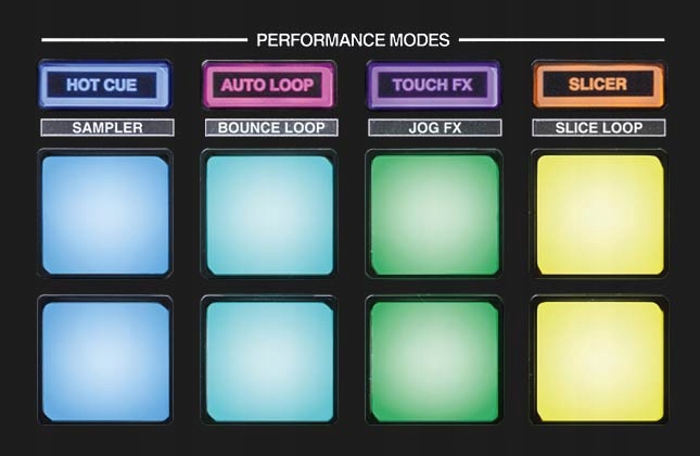 у режимі Touch FX ви можете визначити та використовувати до 8 різних попередньо встановлених FX FX до 8 різних динамічних прокладок FX. Інтенсивність ефектів можна контролювати тиском на вибрану майданчик. Режим JOG FX дозволяє модулювати два ефекти за допомогою колеса JOG. Це дозволяє точно регулювати інтенсивність ефектів та їх параметрів. Підсвічування пробіжок повідомить про вибраний ефект та регульований параметр.
