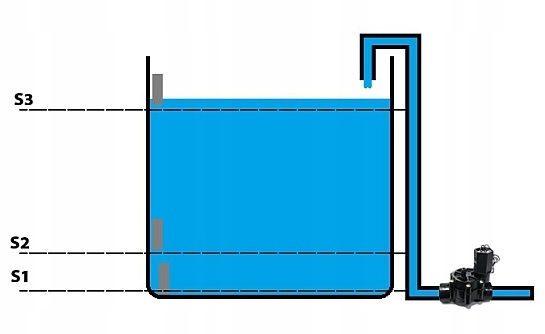 - S3: верхній зонд. Ми розміщуємо зонд на висоті резервуара, на якій ми хочемо, щоб контролер визначав цю точку як максимальний рівень води в резервуарі - коли рівень води досягає рівня цього зонда - наповнення резервуара водою з водопроводу буде буде вимкнено / електромагнітний клапан закриється.