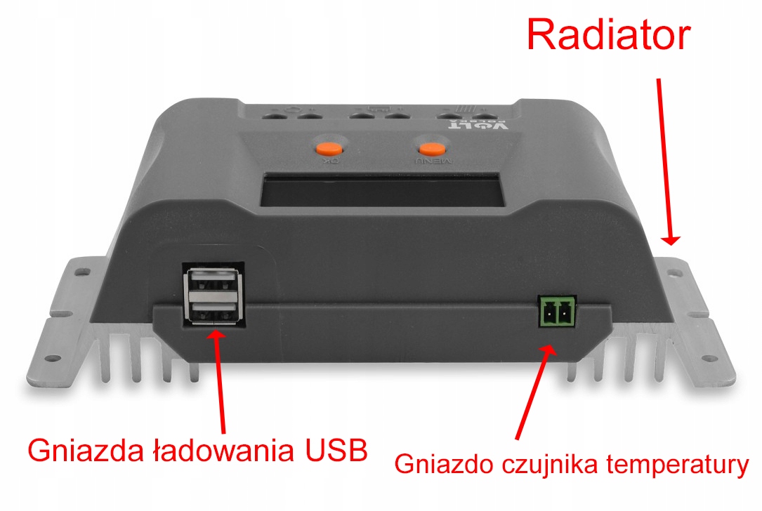 - Датчик температури з автоматичною температурною компенсацією (якщо температура перевищує встановлене значення, струм заряджання зменшуватиметься, щоб знизити температуру)