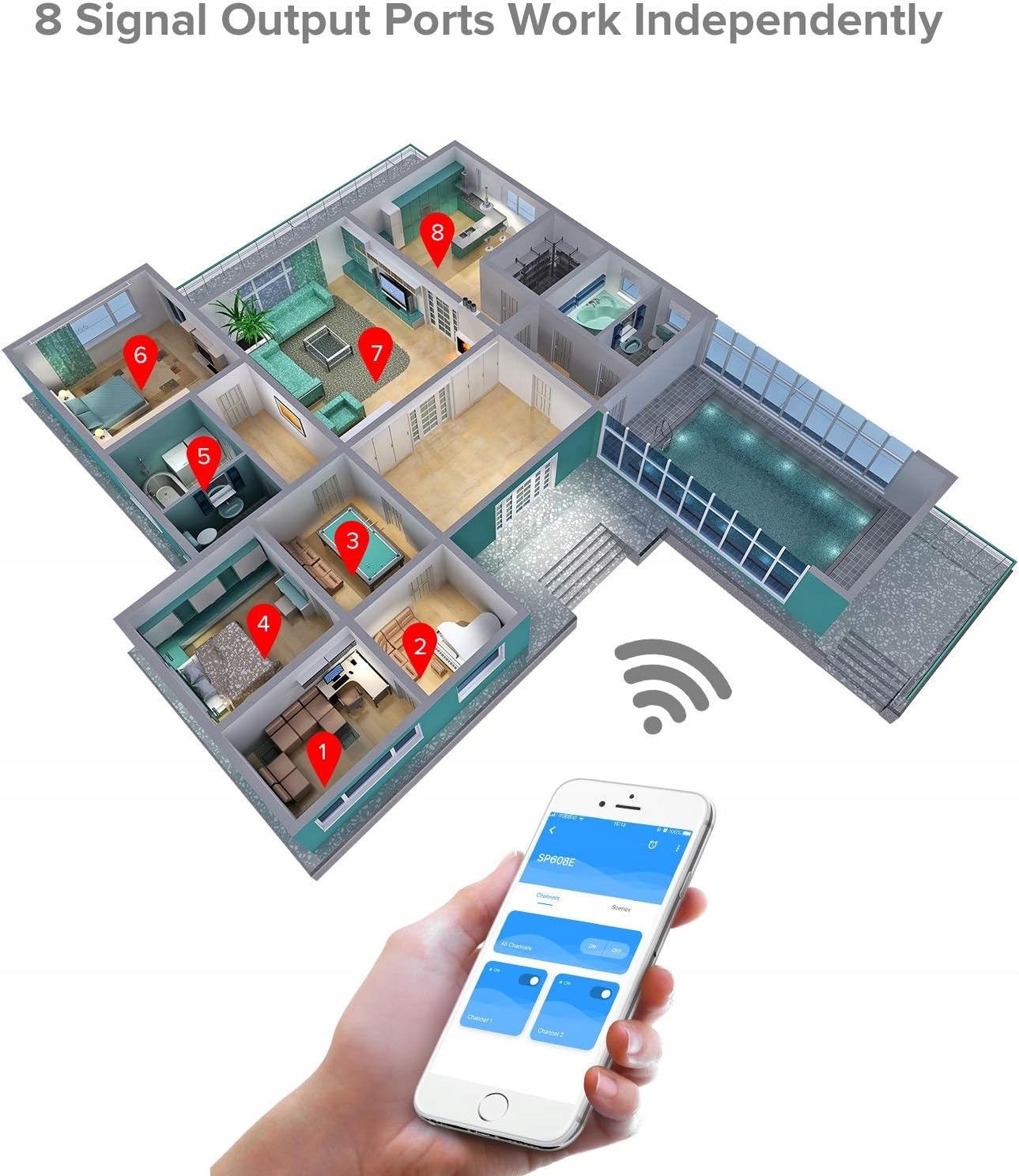 Контролер SP608E має 8 каналів, до яких ми можемо підключити загалом 4800 пікселів, можна контролювати всі зони одночасно або кожну зону окремо. Керуйте за допомогою пульта дистанційного керування, що входить в комплект, або за допомогою додатку для смартфона. Можливість управління освітленням в ритмі музики. Контролер має захист від зворотного введення живлення. Для статичних кольорів ви можете ввести значення коду кольору, щоб точно знайти потрібне значення макета.