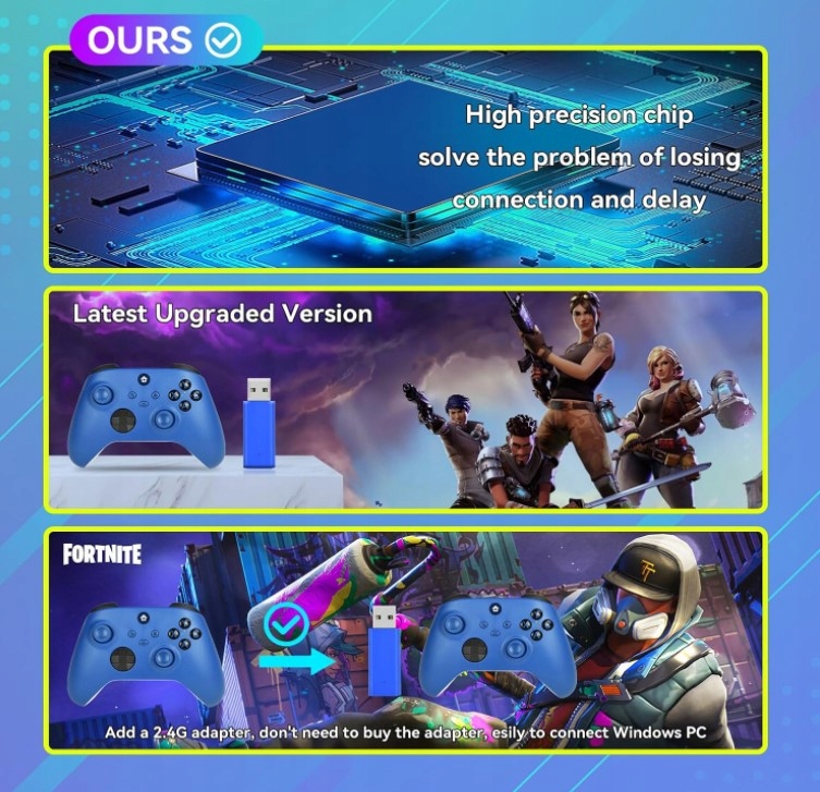Текстуровані тригери, бампери, гібридна клавіатура, відображення кнопок і технологія 2.4G підключаються до будь-якої сумісної гарнітури через роз’єм 3,5 мм для навушників.