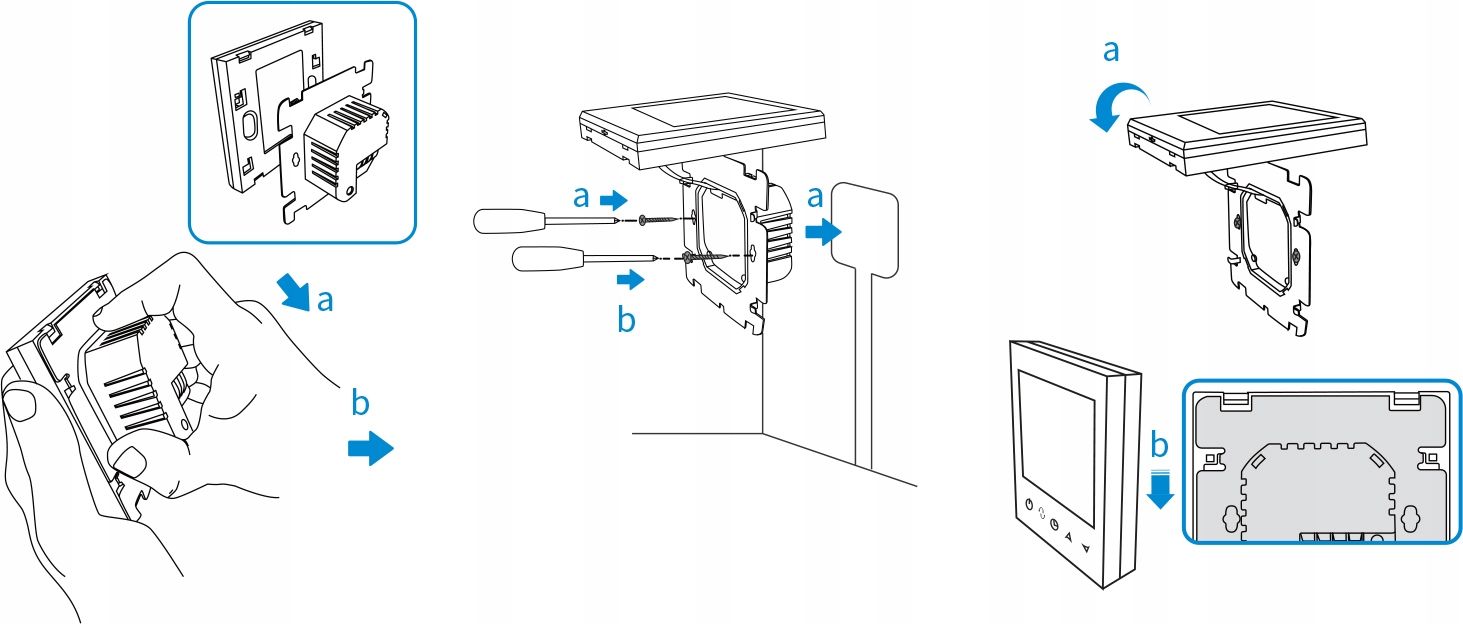 Місце встановлення термостата має забезпечувати захист від погодних умов. Термостат RT10 призначений для настінного монтажу за допомогою стандартної електричної коробки Ø60 мм. Термостат повинен бути встановлений на висоті 1,2 - 1,5 м над землею, на відстані не менше 30 см від дверей і вікон. Термостат кріпиться до коробки через монтажні отвори в задній частині корпусу. Перед встановленням зніміть задню частину корпусу, як показано на малюнках вище.