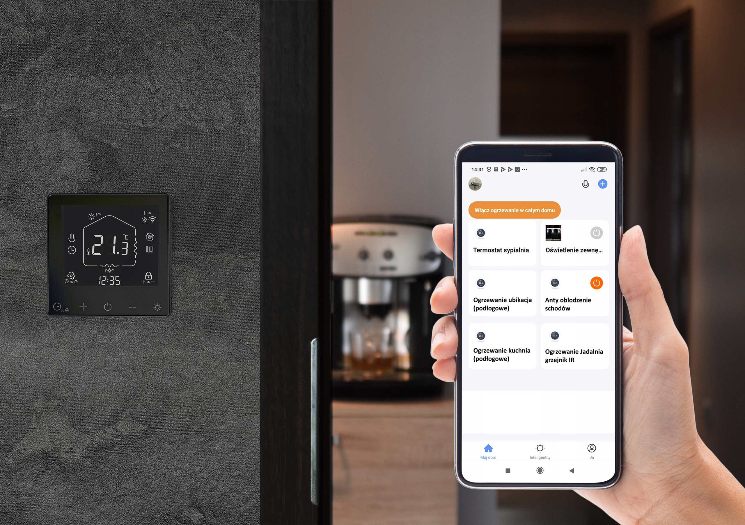 Термостат із функцією Wi-Fi дозволяє контролювати температуру за допомогою телефону чи планшета з пристроїв на базі Android або iOS, зокрема через Додаток SMART LIFE, TUYA та інші.