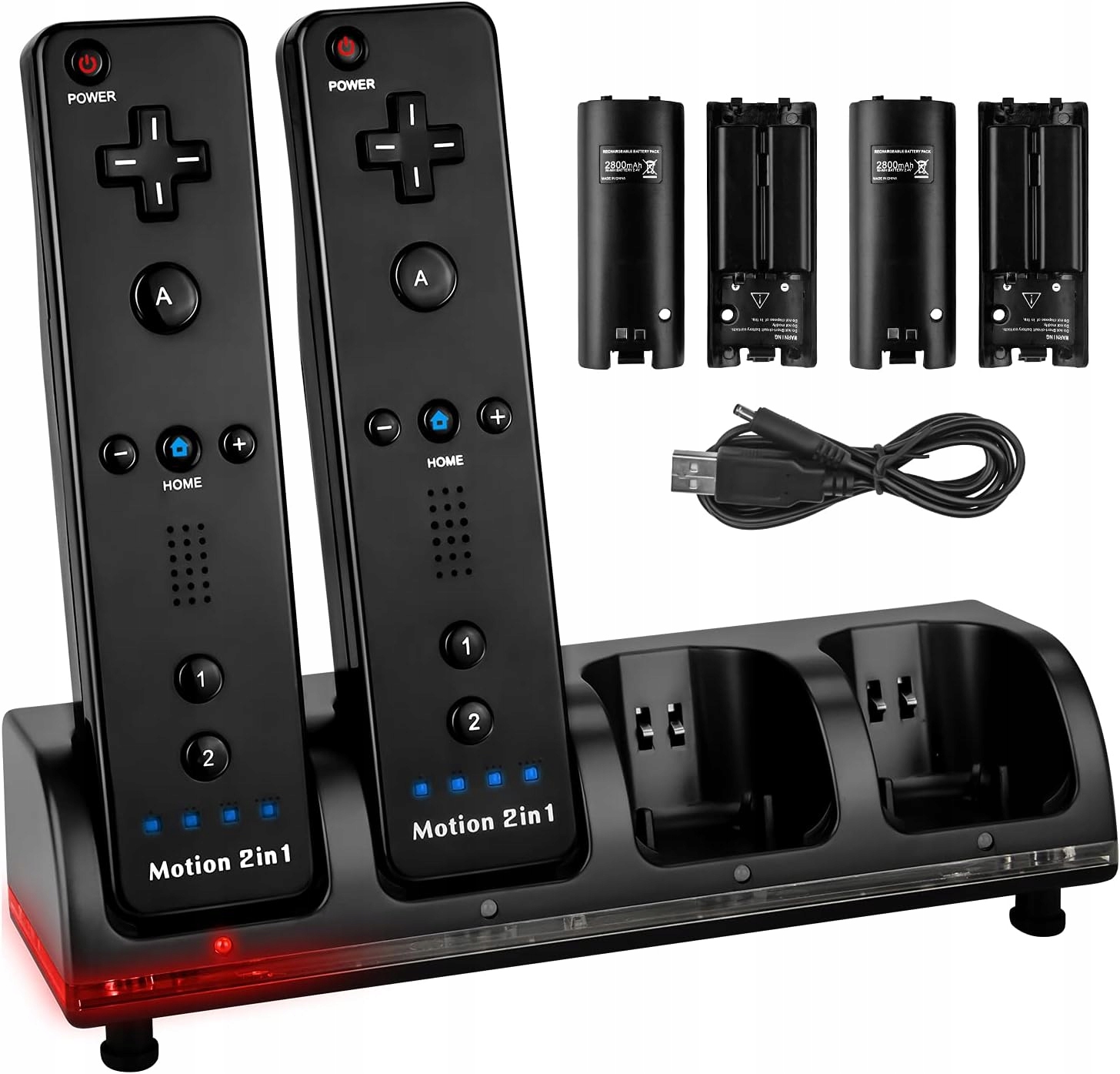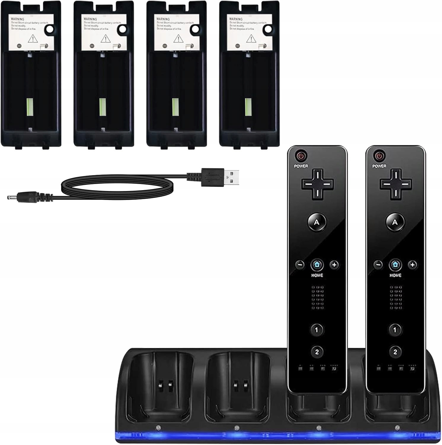 живлення за допомогою USB -кабелю, прикріпленого до консолі Wii, подвійного заряду Standard Shorts Wii дистанційні керування, підставка має делікатну підсвічування та індикатор зарядки світлодіодного значення.