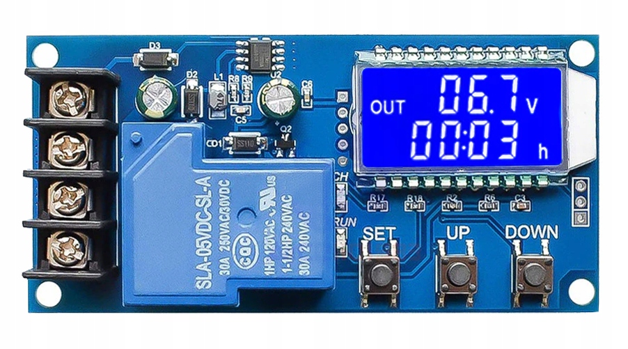 Щоб увімкнути цей режим, потрібно встановити параметр OP. Реле включається і зарядка відбувається, коли напруга батареї нижче нижньої межі напруги dn. Реле вимикається, коли напруга батареї досягає верхньої межі напруги UP або коли закінчується відлік часу. Якщо напруга батареї нижча за dn, реле вмикається, навіть якщо закінчився час OP. Модуль автоматично вимкне функцію контролю часу заряджання.