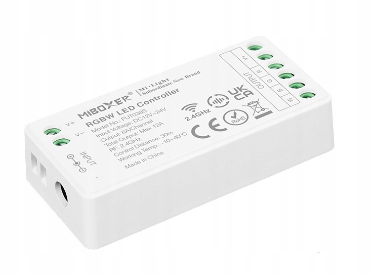 Модель FUT038S - остання версія зонного контролера MiLight для світлодіодних стрічок RGBW з напругою 12В-24В. Зменшені розміри, збільшена потужність і можливість змінювати частоту ШІМ-модуляції роблять його неперевершеним і безвідмовним рішенням такого типу на ринку.