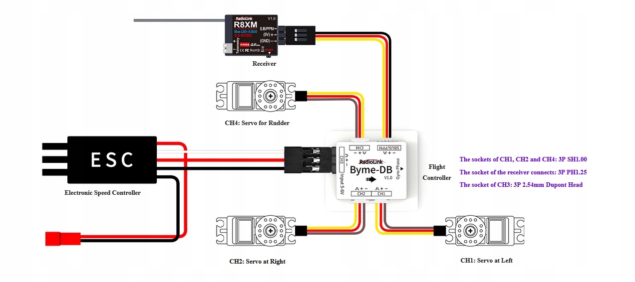 Byme-D тестується на ринку протягом 5 років. Byme-DB продовжує оптимізувати оптимальні параметри PID на основі Byme-D. Четвертий вихідний канал додано на основі Byme-D. Крім традиційного дельтоподібного крила, його також можна використовувати для дельтовидного крила з кермами тощо. Не потрібно налаштовувати параметри. Під час першого підключення потрібно налаштувати лише перемикач режимів керування польотом і калібрування контролера польоту.