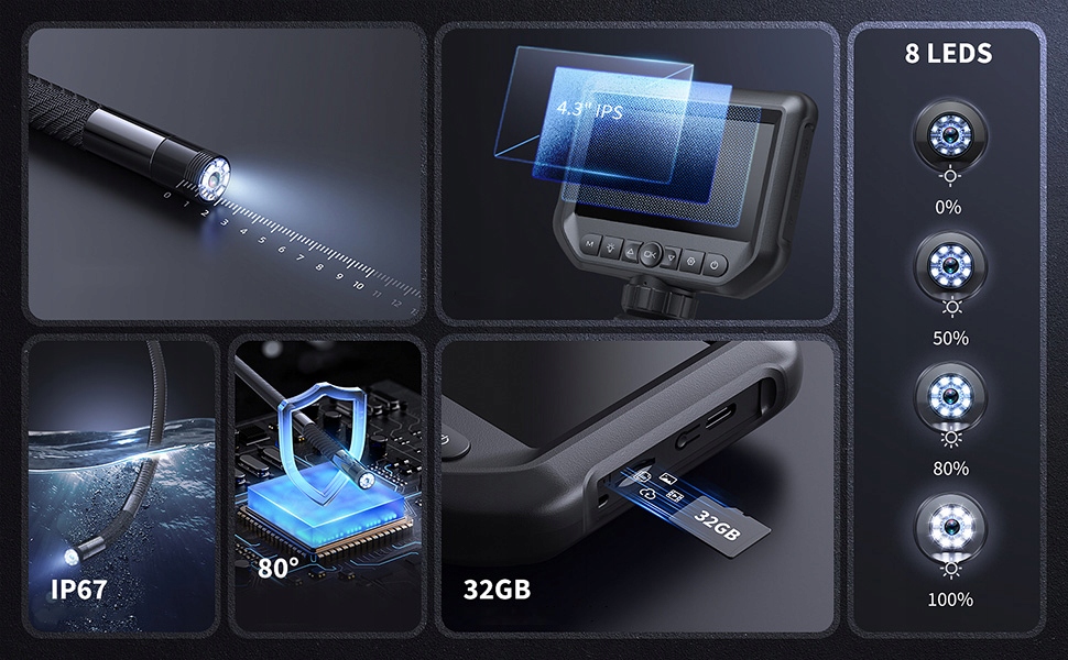 оснащений 8 світлодіодами високої інтенсивності з 4-градусною регуляцією яскравості, забезпечує чітке зображення навіть у умовах поганого освітлення. Напівпрофесійний кабель з довжиною 2 м забезпечує хорошу гнучкість і жорсткість, задовольняючи різні потреби використання. Водонепроникна конструкція IP67 забезпечує безпечне використання в басейнах, трубопроводах та під час дощу.
