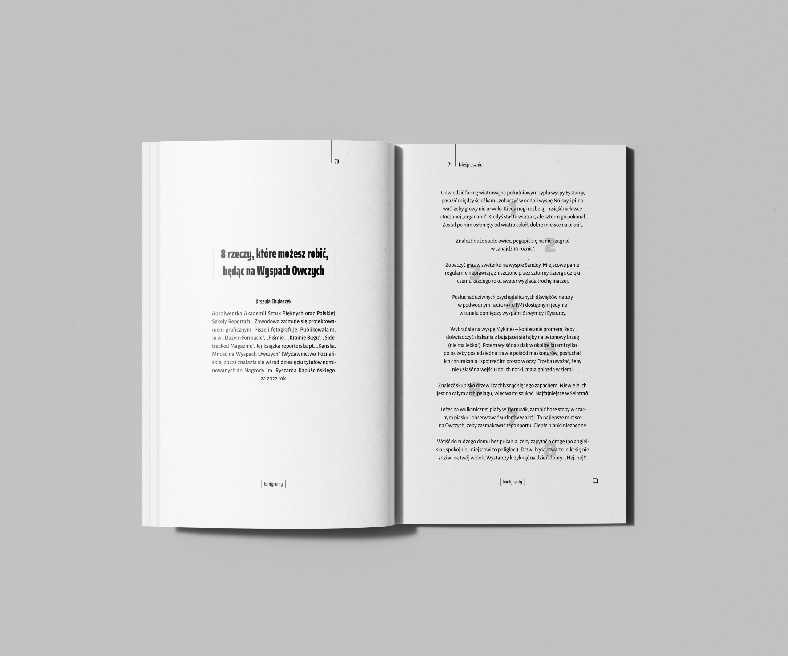 Ми подорожуємо стежками — і поза стежками — Каталонії, Кантабрії, Астурії, Кастилії та Леона. Ми шукаємо польські сліди в Скоп’є, Північна Македонія. Ми заглиблюємося в таємні історії дипломатичних ігор навколо німецько-радянської Рапалльської угоди, яка шокувала Європу, і водночас блукаємо вишуканими готелями, недоступними апартаментами, церквами та пляжами Генуезької затоки. Ми зриваємо завісу туристичної ілюзії зі Шрі-Ланки і заглиблюємося в сліди вічного, кривавого конфлікту між сингалами і тамілами. Шукаємо рай на острові Сокотра - і що знаходимо...? Ми зустрічаємося з потойбічними героями народних міфів і чаклунства з бразильської фазенди. Ми намагаємося втекти від задушливої атмосфери перуанського порту посеред джунглів Амазонки. Ми шукаємо свободу в Ірані, подорожуючи цією країною на Volkswagen Cucumber. Ми з’ясовуємо, чим ви можете зайнятися – у вільний час – на Фарерських островах і на норвезькому півострові Варангер. Ми ганяємось за абсурдом, дізнаючись про життя уявного чеського героя Яри Цімрмана та намагаючись не відставати від нашого реального до глибини душі героя – Матеуша Валігори – в Антарктиді. І разом з Віславою Шимборською ми проводимо пальцем по карті. І багато іншого.