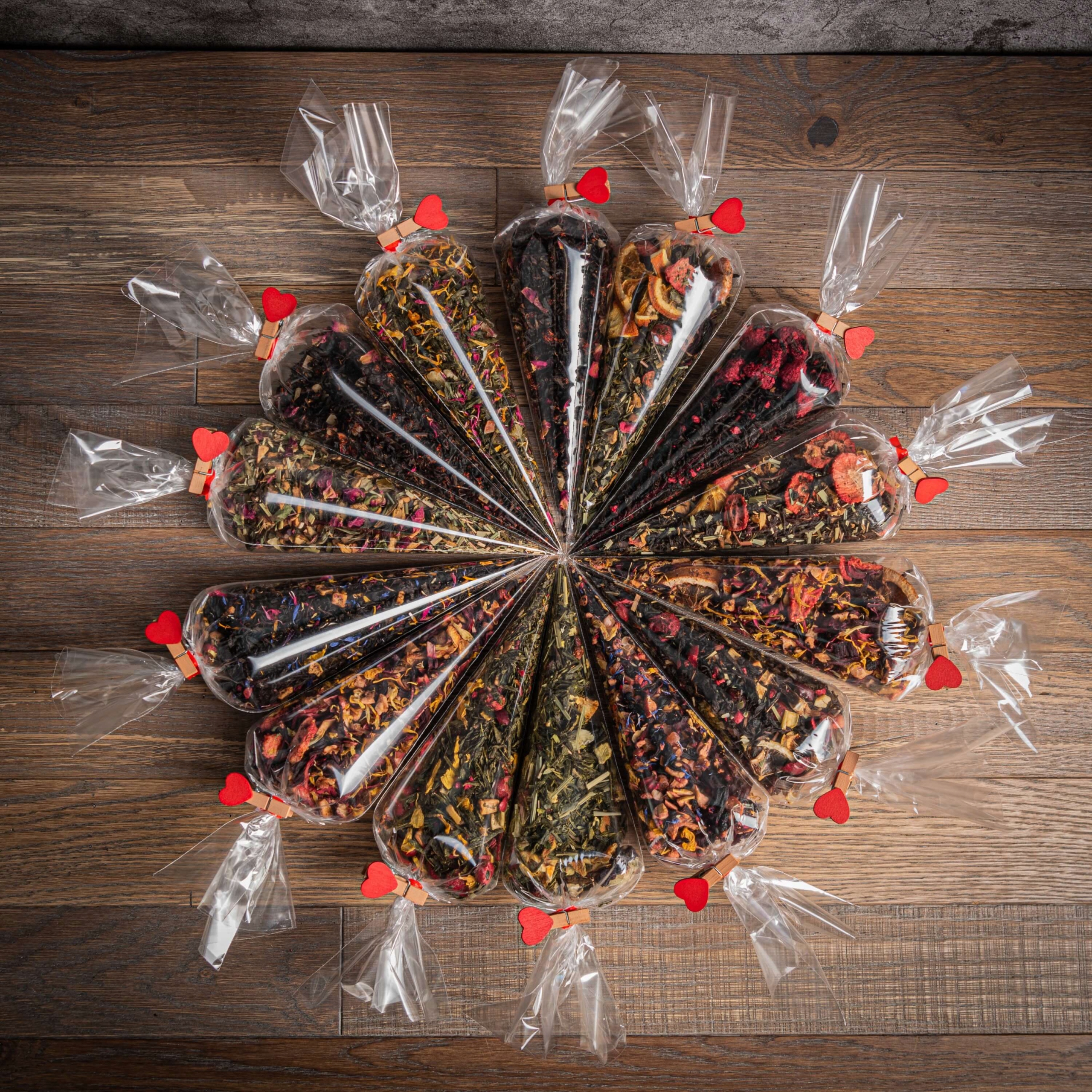 Целофановий ріжок із високоякісним розсипним чаєм, вибраним із наведеної нижче палітри