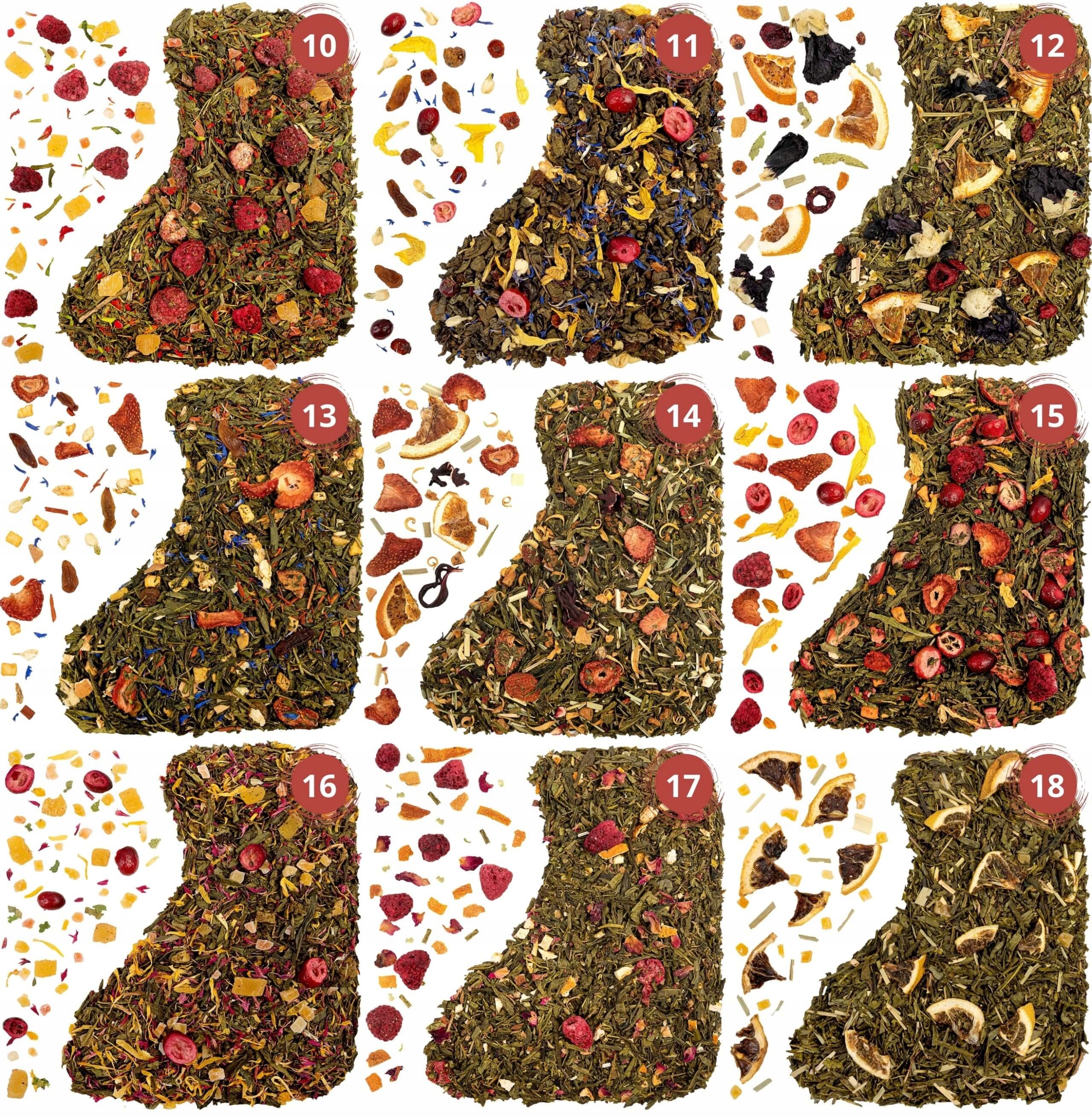 - 12. «Апельсинове небо»:зелений чай сенча, цедра апельсина, сушені плоди апельсина, горобина, квітка глоду, ліофілізована вишня, лимонник, ліппія, мальва, аромат.