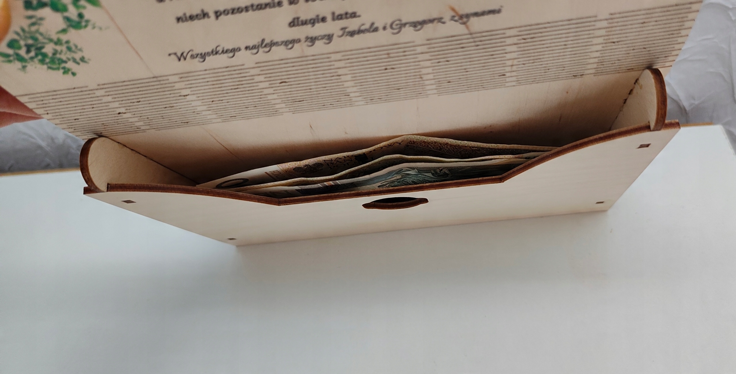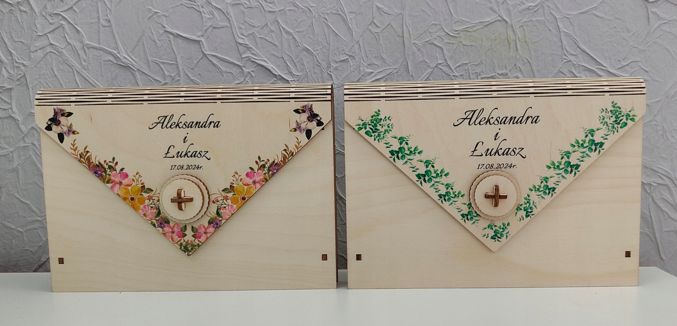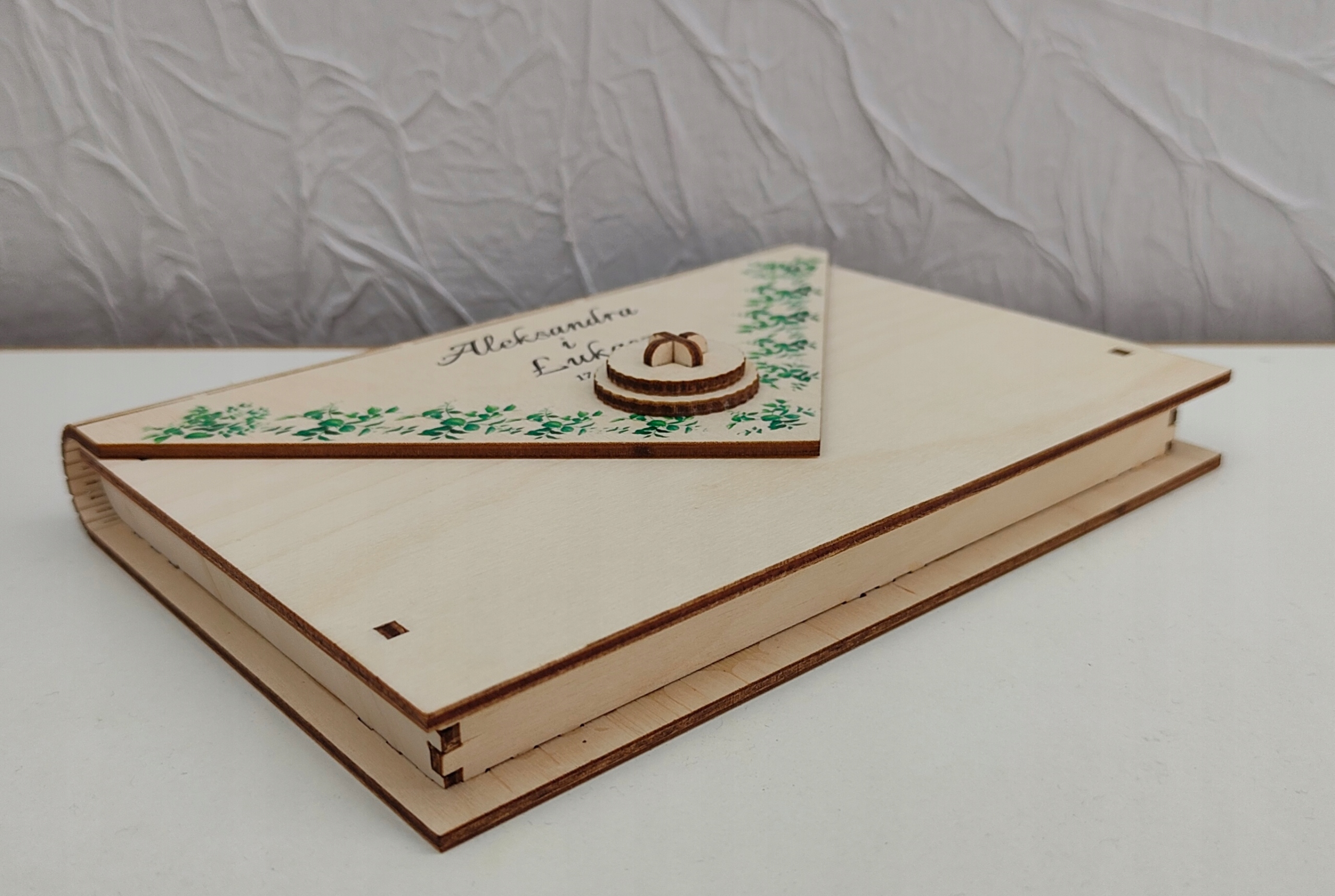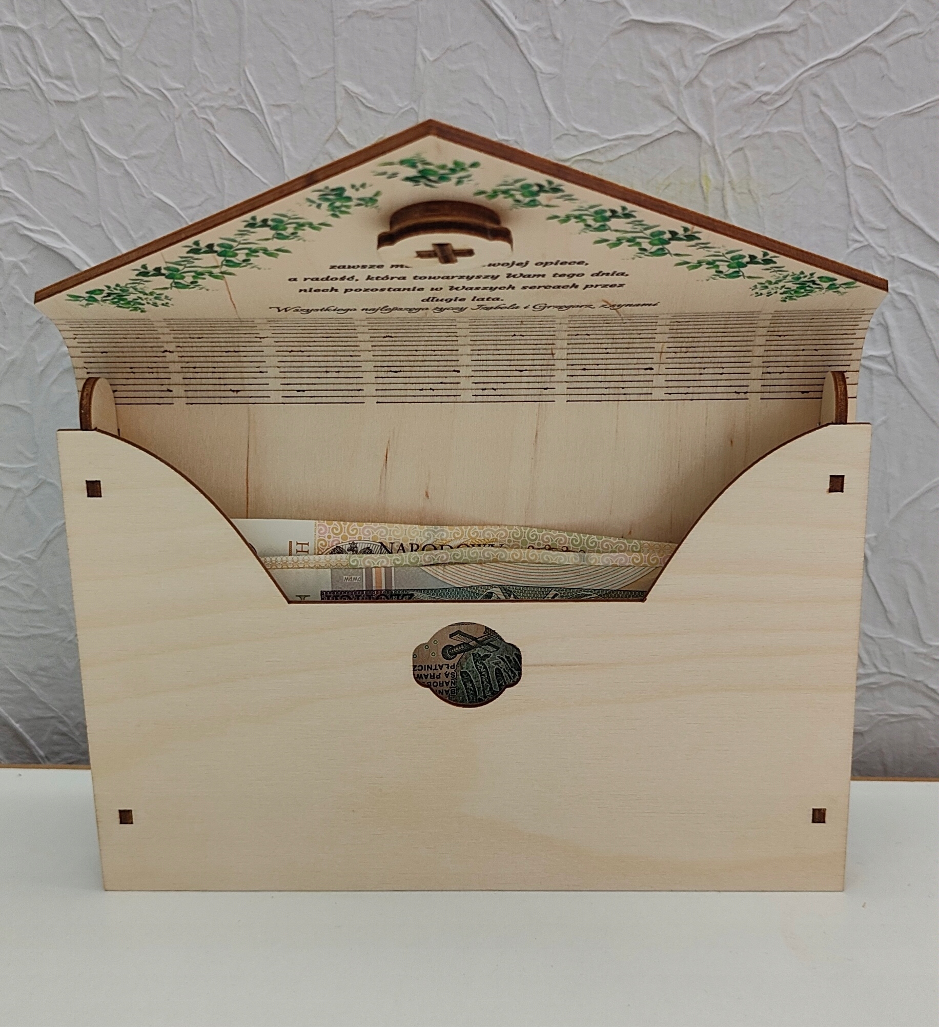 Конверт виготовлений з фанери 3 мм, збагачена барвистим УФ -принтом - у цій моделі вони зелені листя, розміщені на зовнішніх конвертах.