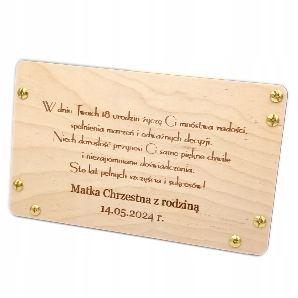 дерев’яний конверт на 18 -й день народження унікальний через персоналізовану гравюру , яка розташована попереду і на задній частині конверта з побажаннями від вас. День народження у вигляді дерев’яного конверта за гроші, який стане сувенрим на наступні роки!