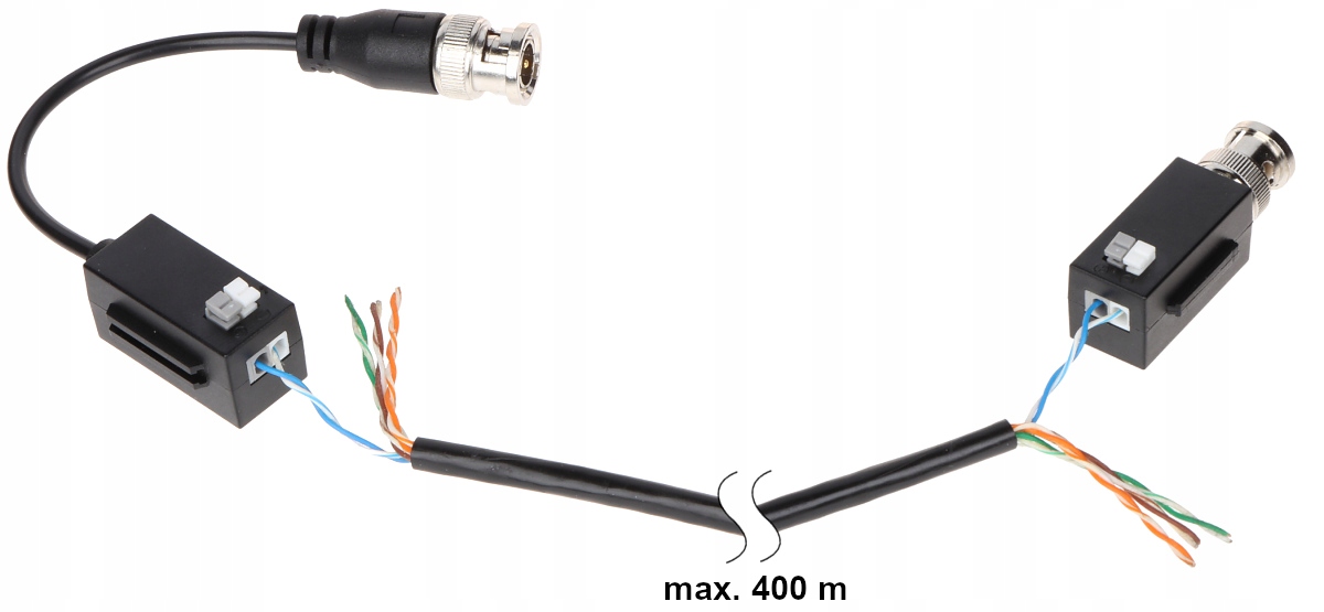 PFM800B-4K призначений для передачі відеосигналу по кабелю типу вита пара. Пристрій регулює імпеданс коаксіального кабелю 75 Ом до опору симетричного кабелю, забезпечуючи передачу відеосигналу до 400 м (кабель вита пара категорії 5) і усуває асиметричні перешкоди. Зверніть увагу на правильне підключення (+) і (-) клем. Зворотне підключення призведе до спотворення зображення.