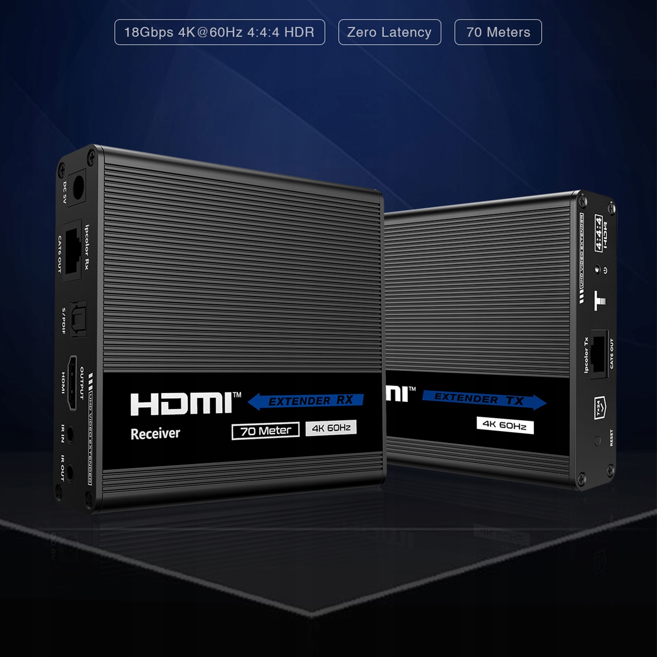 Подовжувач HDMI забезпечує передачу i Розширюйте нестиснений сигнал HDMI 4K @ 60 Гц через кабель Мережа CAT6/6A/7, відстань передачі до 70 метрів Роздільна здатність 4K з нульовою затримкою. У комплект входить передавач (TX) і блок приймача (RX), що працюють як пара. Прилад має Двонаправлені ІЧ функції та можуть бути підключені каскадним способом додатковими приймачами (RX).