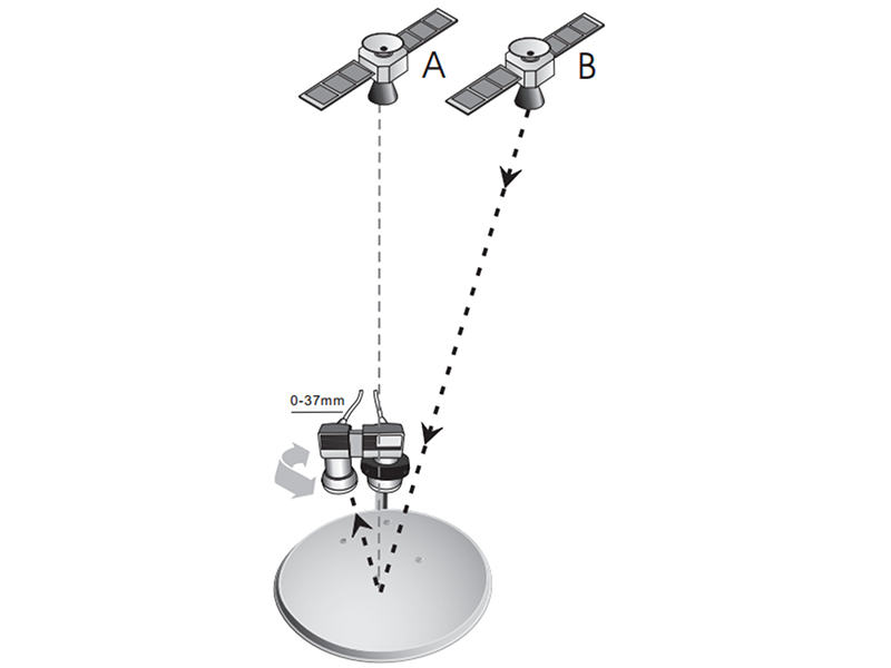 Він використовується для прийому двох близько розташованих супутників. Це найпростіше доступне рішення для постійного прийому двох супутників на одну антену. Крім того, конвертери можна регулювати (діапазон регулюваної відстані 0-37 мм).