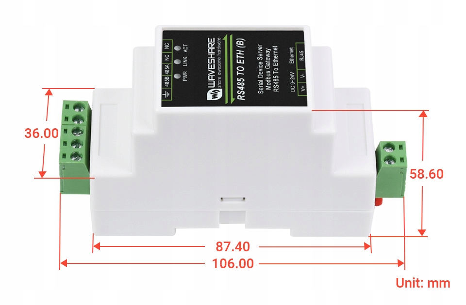 це промисловий медіаконвертер RS485 до Ethernet у корпусі для монтажу на DIN-рейку. Він поєднує багато функцій в одному, включаючи послідовний сервер, шлюз Modbus, шлюз MQTT, RS485 до JSON тощо. Пристрій забезпечує прозору передачу даних. Підтримує протокол шлюзу Modbus RTU / Modbus TCP.