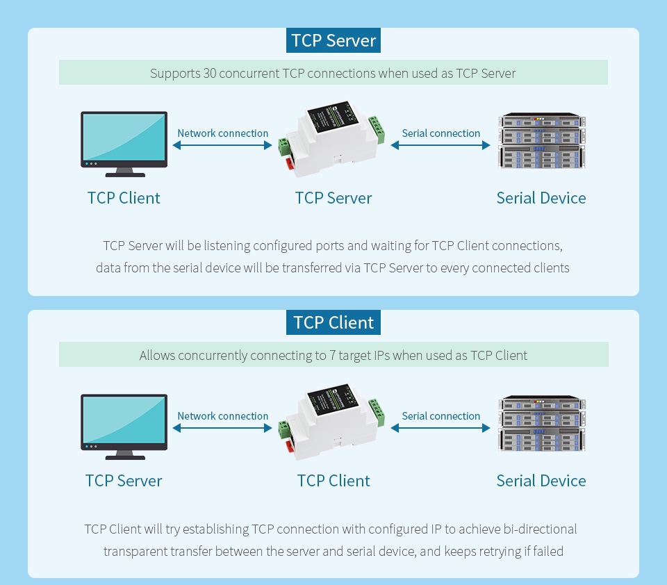 підтримує TCP-сервер / TCP-клієнт / режим UDP / групову розсилку UDP