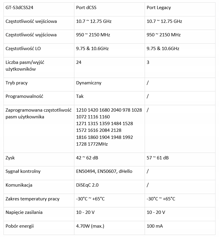 Конвертер Unicable SCR GT-SAT GT-S3dCSS24 LNB має однопровідну (послідовну) передачу сигналу до макс. 24 приймачі з маркуванням Unicable II, також мають три стандартних виходу сигналу LEGACY.