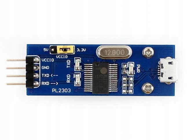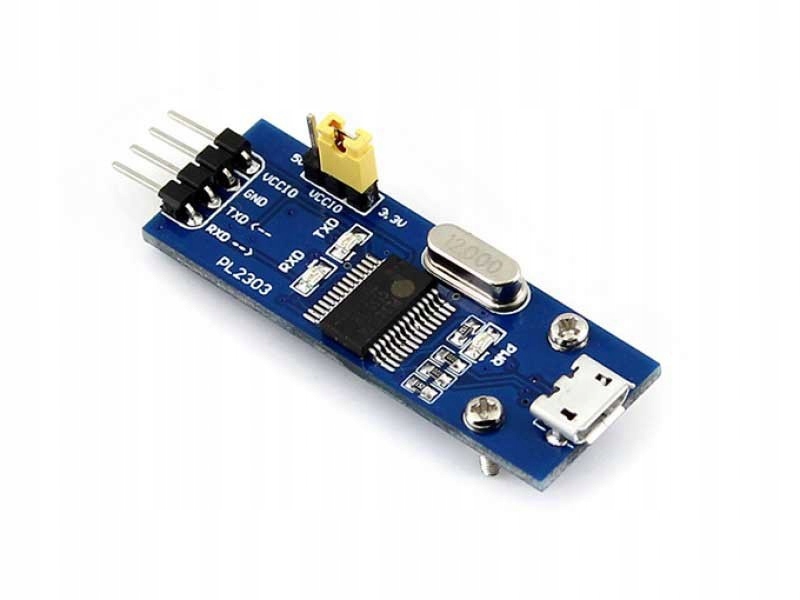 Конвертер USB-UART Waveshare на основі системи PL2303, оснащеної портом micro-USB. Залежно від положення конфігураційної перемички, модуль може живитися від USB 5 або 3,3 В, також можна живити його від іншої плати через золоті роз’єми.