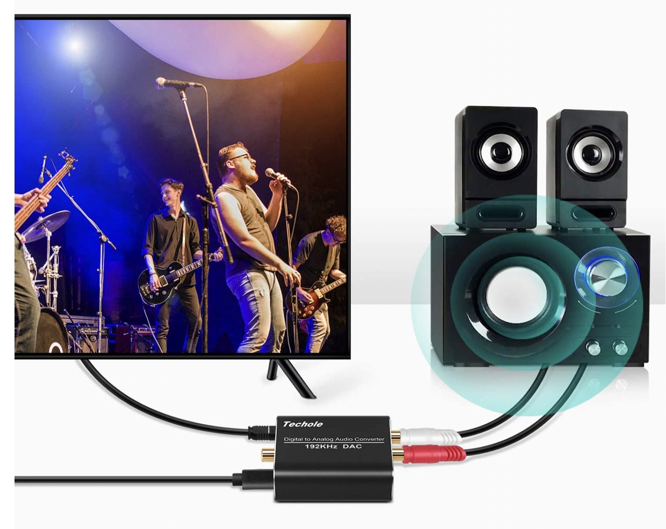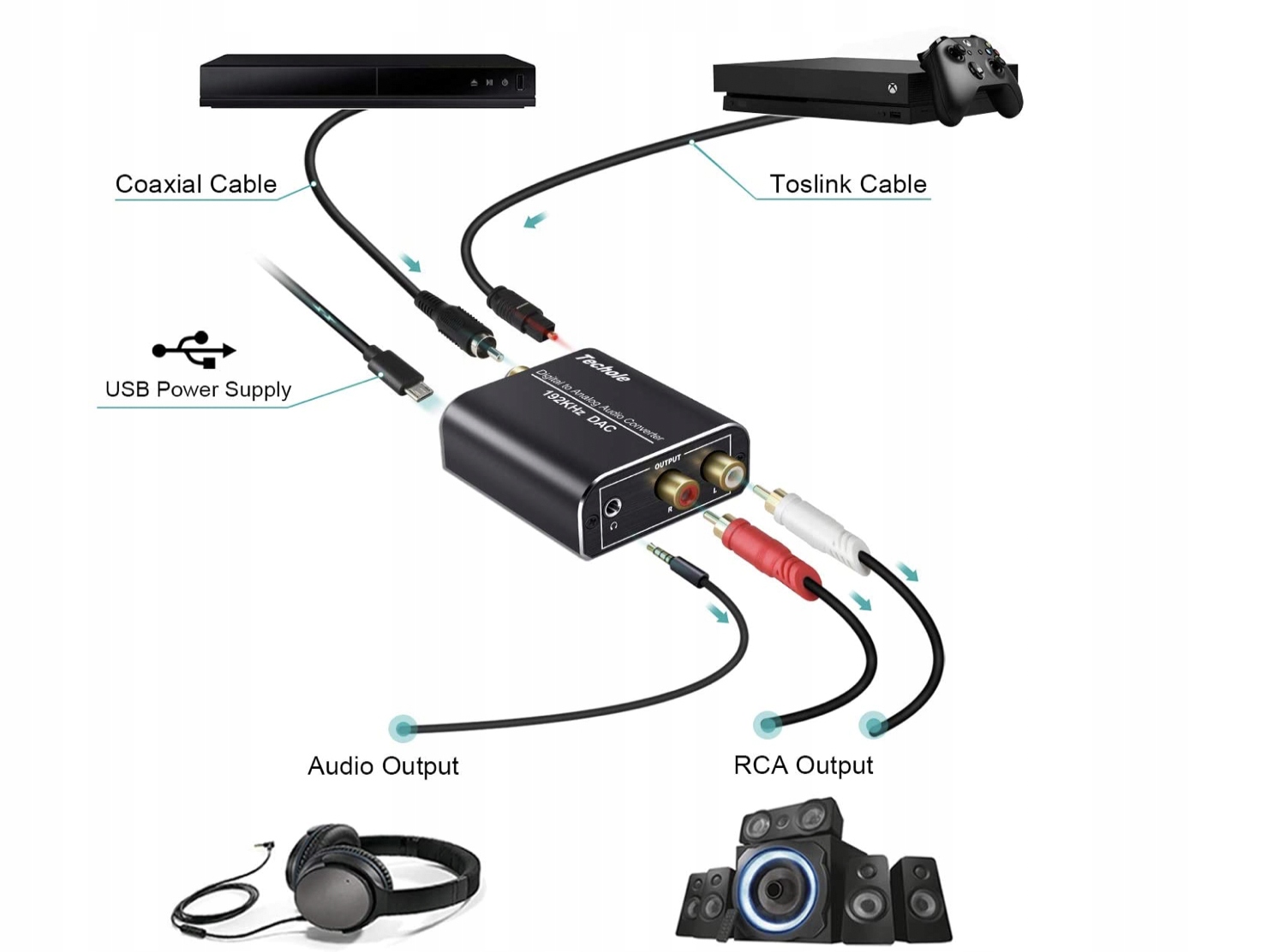 【Аудіоконвертер】 Компактний ЦАП перетворює цифрові сигнали (Toslink/коаксіальний) в аналогові сигнали (Cinch L/R або 3,5-мм роз’єм). Живлення подається через кабель живлення 0,5 Вт (5 В 1 А), який можна під’єднати до будь-якого роз’єму USB.