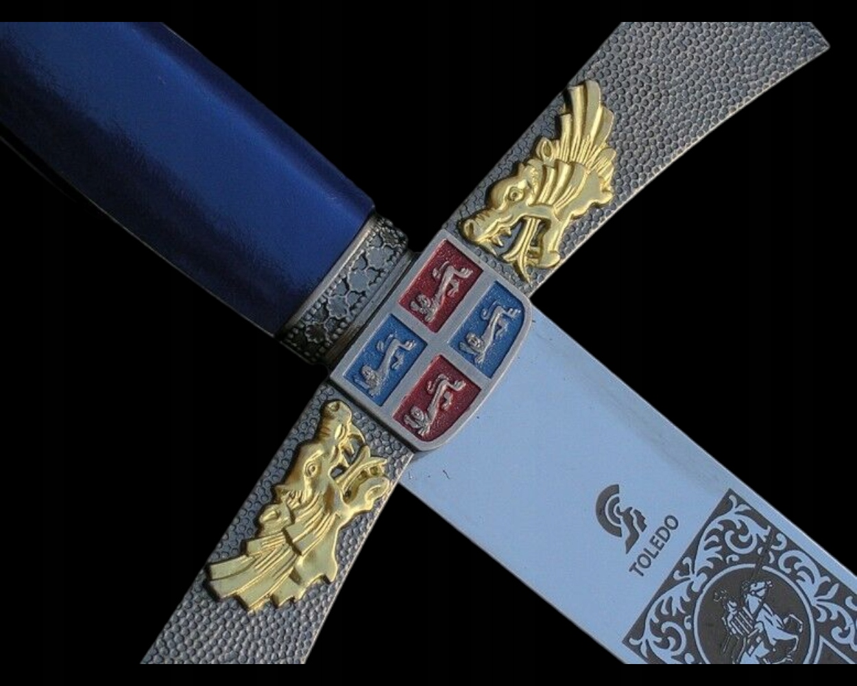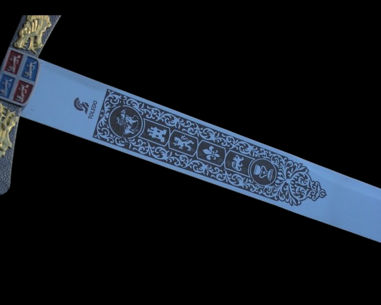 Клинок: високовуглецева толеданська сталь, підпис, вигравіруваний з обох боків мотиви лицарства та герба