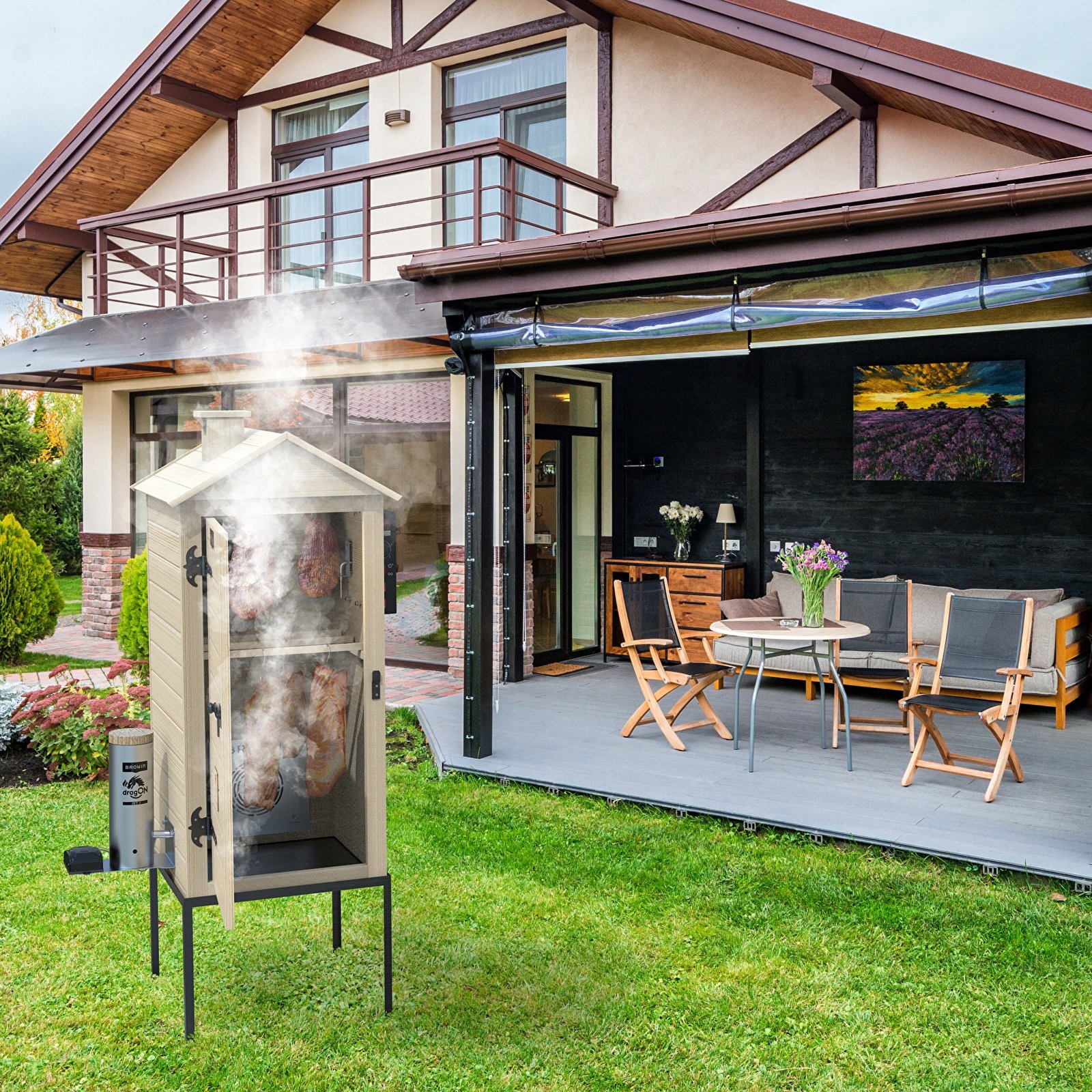 - Все в одному, високоякісний комплект - коптильна камера з добірної полірованої деревини ялини, відкривається дах, стійкий металевий каркас, камін, решітка , балки та гаки, димогенератор з електричним насосом та деревною тріскою.