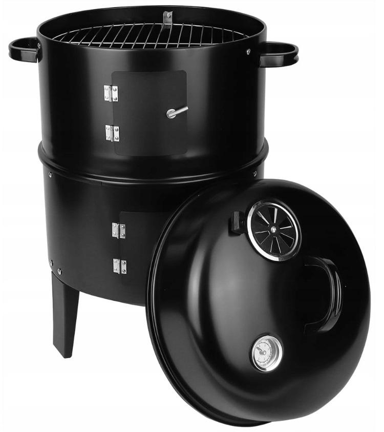 Конструкція поділена на дві камери та третю як камеру згоряння. Це дозволяє готувати на парі, грилі, запікати та коптити. Завдяки термометру ви можете вільно регулювати температуру за допомогою верхнього отвору, який при правильному відкритті регулює температуру всередині. З двома решітками для гриля ми маємо дуже велику поверхню гриля, що дозволяє обробляти великі продукти (наприклад, цілу курку, індичку, ребра). Вертикальна конструкція не займає великих площ в саду або на терасі. Гриль має пару дверцят, завдяки яким ви можете контролювати стан страви на грилі. Поверхня захищена від корозії.