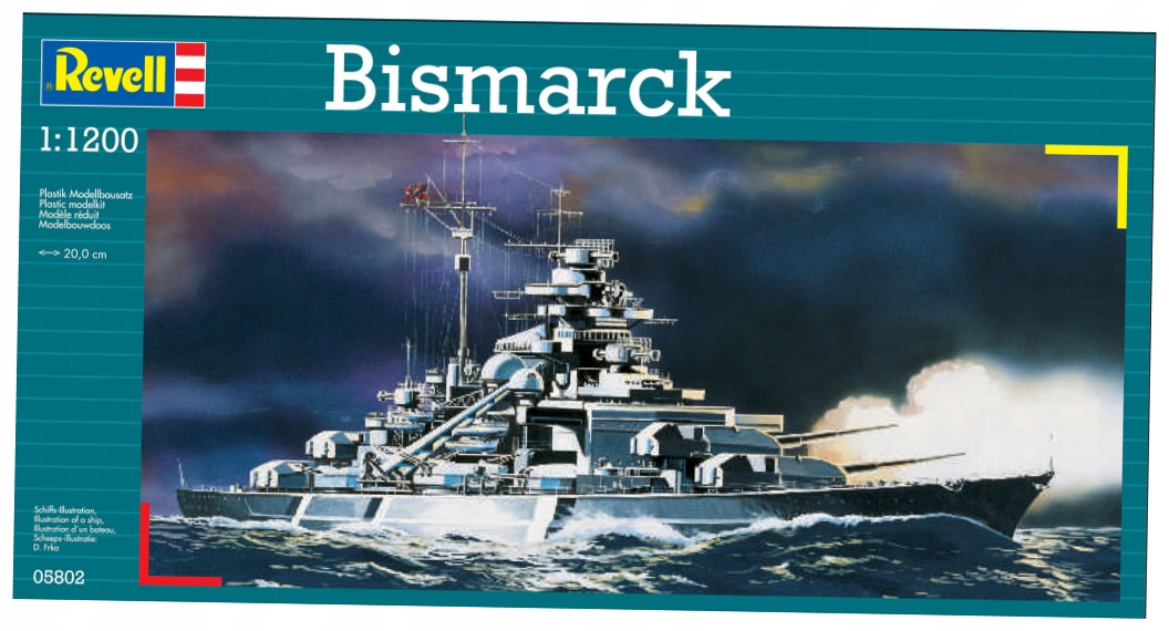 Пластикова модель для приклеювання Revell (Rev-05802) не включає фарби та тирпіц, Бісмарк, флагманський корабель Крігсмариновий, був найбільшим німецьким військовим кораблем з переміщенням 50 900 тонн та екіпажем 2092 року люди. Він був представлений на службу 24.08.1941. Разом з кораблем Prinz Eugen його виявляли британські розвідувальні літаки. Британський броненосець HMS Hood в сутичці, який відбувся 24.05.1941. Після тривалої гонитви Бісмарк потрапив у торпеду з британського літака, перехопленого британським бронзатом королем Джорджем V та Родні. 27.05.1941 Бісмарк був заточений власним екіпажем в 490 км від узбережжя набору: Фюзеляж води до водних ліній хакерських поверхонь Дзядзіеż Дзійдзвігісторичної картини