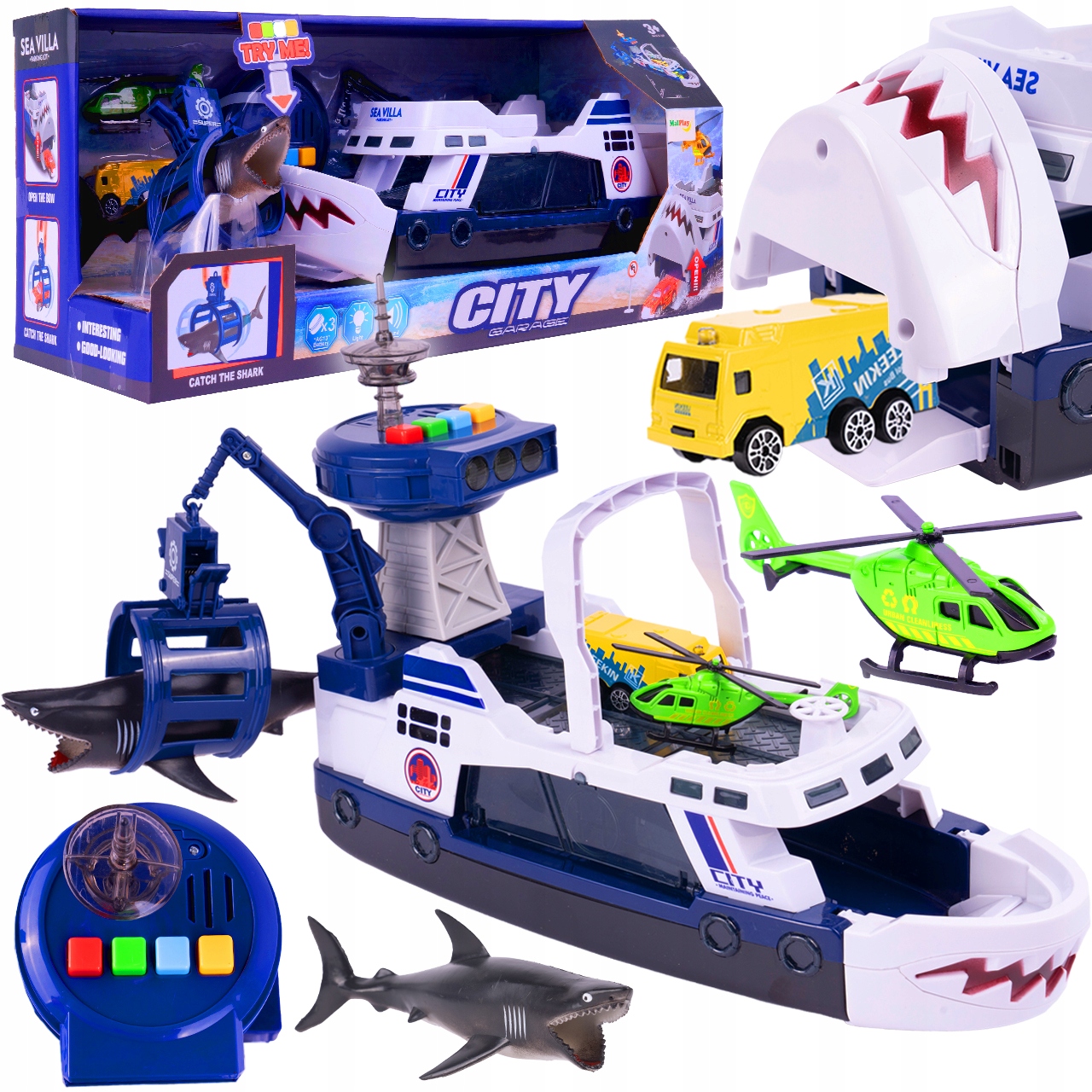 Розміри вантажівки: приблизно 6,5 x 3,5 x 2,5 см Розміри вертольота: приблизно 9,5 x 4,0 x 2,5 см Розміри акули: приблизно 18,5 x 8,0 x 7,5 см Джерело живлення: 3x AG13 (у комплекті)