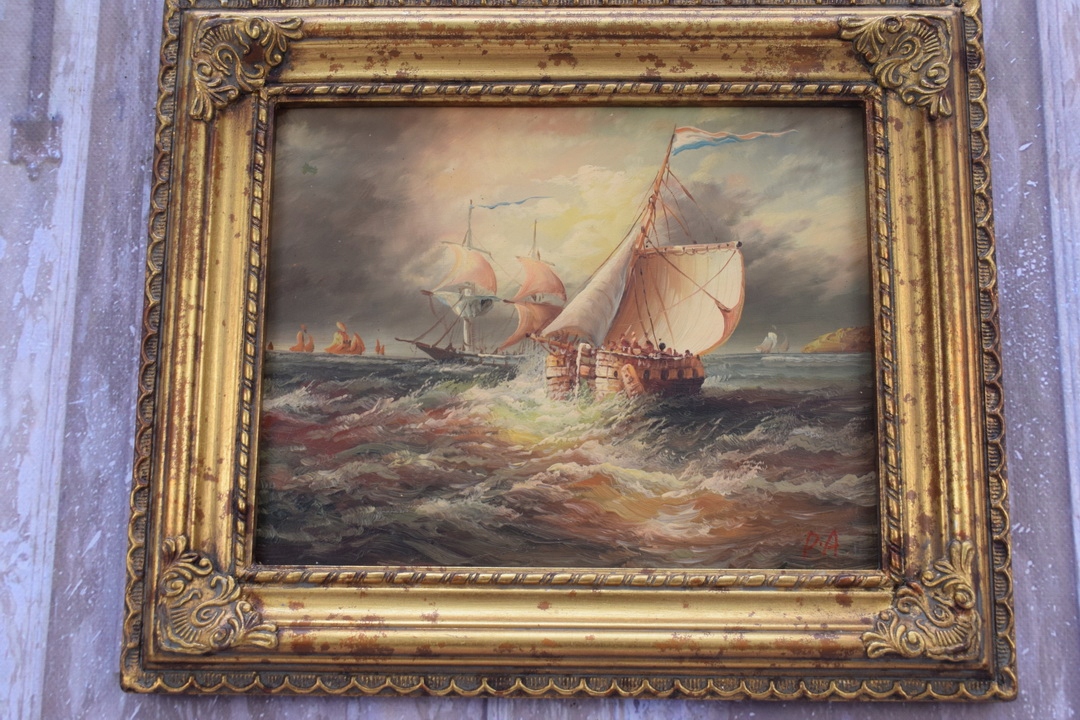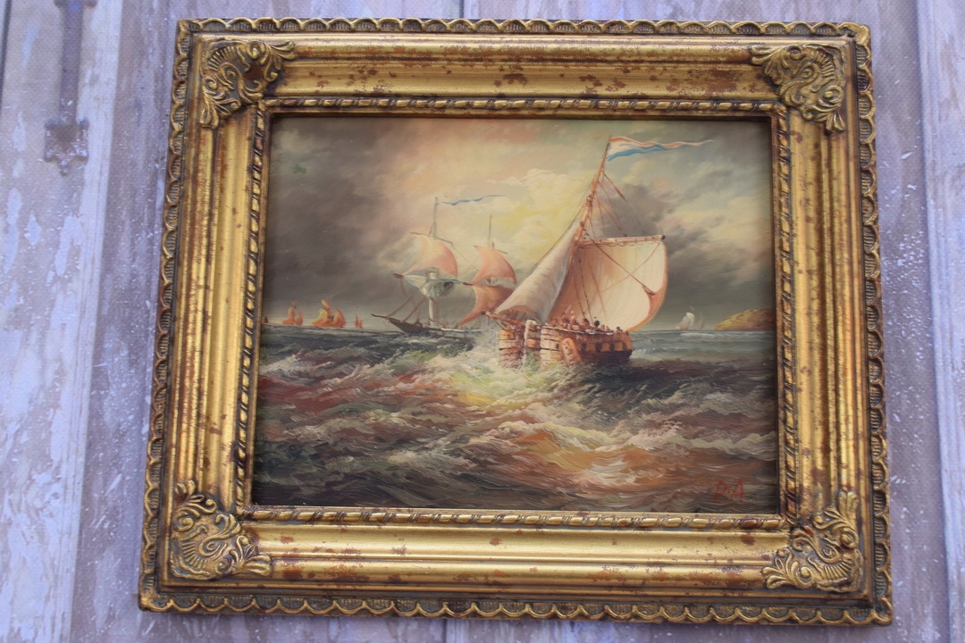 Кораблі в розбурханому морі - Морський - Матрос, картина маслом - Золота рамка
