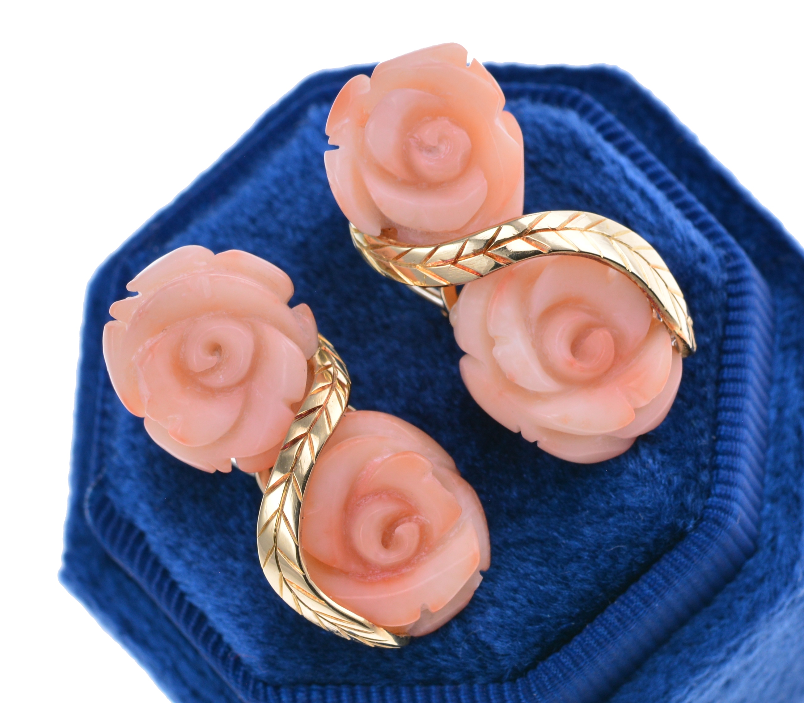Предметом продажу є вражаючі кліпси з високоякісне золото 750 проби та кораловий колір шкіри ангела. Корал, вирізьблений у вигляді троянд, обвитих золотим листям. Брошка йде в набір окремо.
