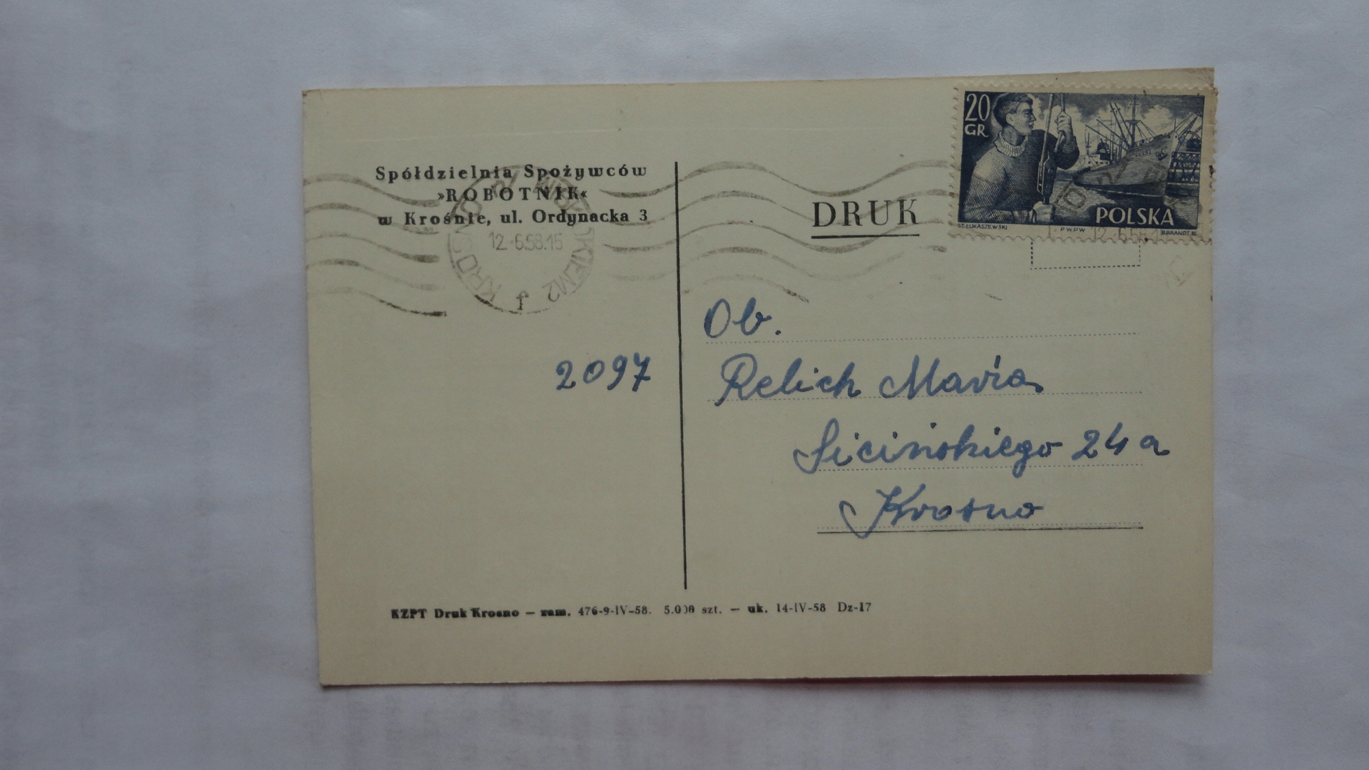 КОРЕСПОНДЕЦІЙНА КАРТА РОБІТНИКА ПРОДОВОЛЬЧОГО КООПЕРАТИВУ КРОСНО 1958р.