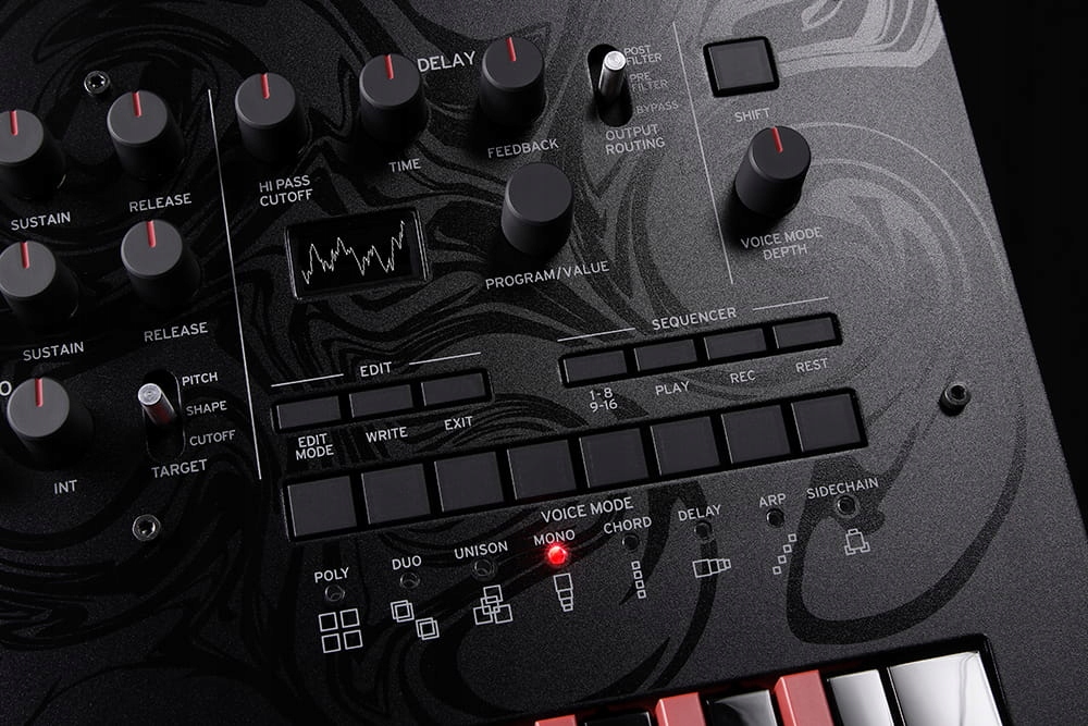 Чотириголосна поліфонічна структура та вісім режимів голосу, успадкованих від мінілогу, зменшують вірогідність кожного звуку буде обрізано під час відтворення, а також створить ще сильніший звук, коли ви складатимете голоси. Натисканням кнопки ви можете запускати різні ефекти, такі як UNISON (який виробляє щільний бас і головний звук), MONO (який додає субосцилятор, який грає на октаву нижче та чудово працює для басу), і DELAY, який ви може запускатися, затримуючи звук.