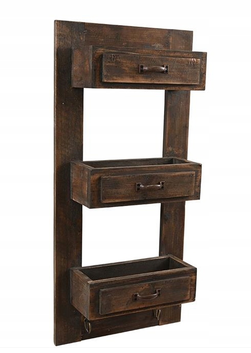декоративна вішалка, виготовлена з темно -коричневого дерева. Він має три полиці у вигляді невеликих ящиків, прикрашених зовні декоративними ручками та двома гачками внизу. Сільський характер вішалки буде ідеальним доповненням як до сучасних, так і для класичних інтер’єрів.