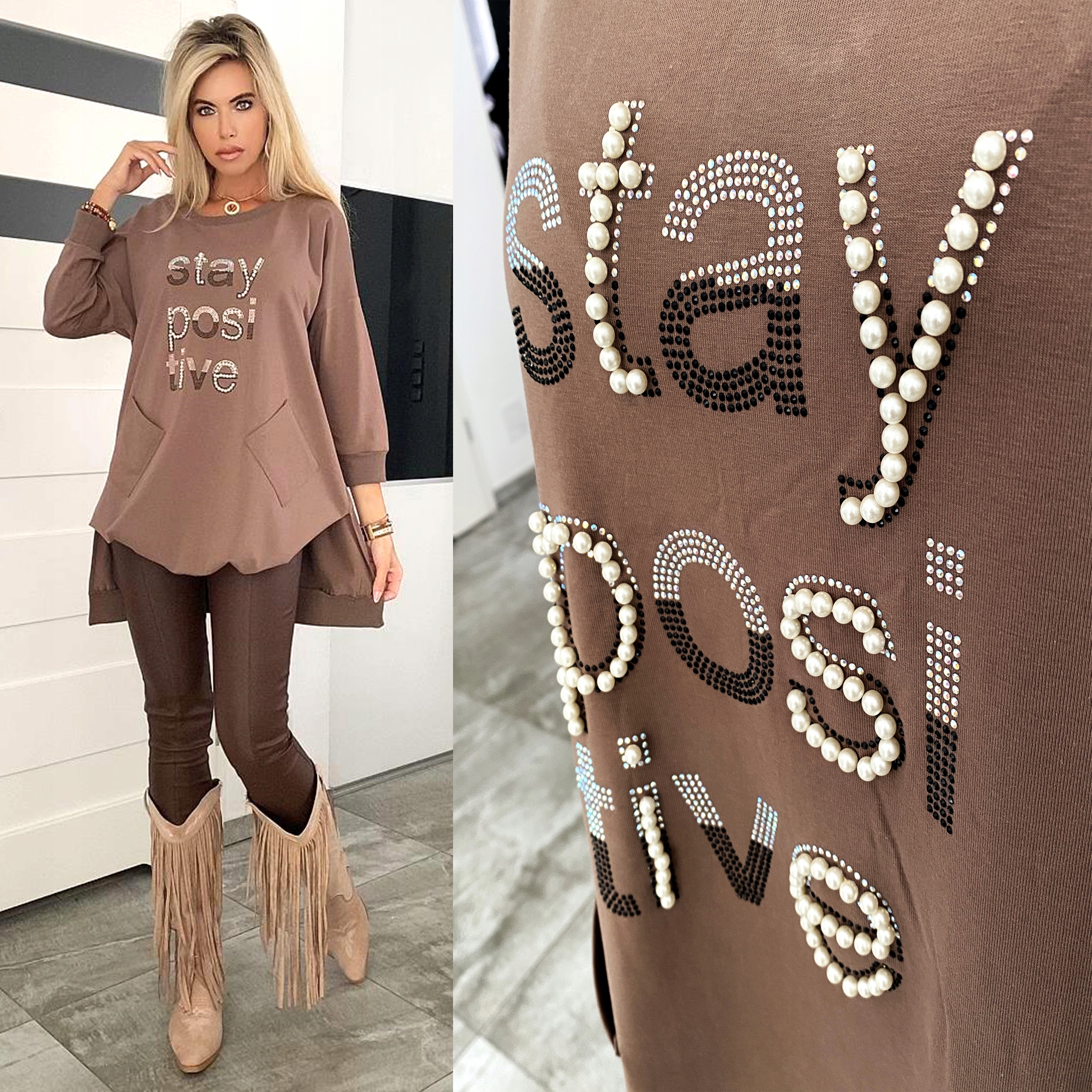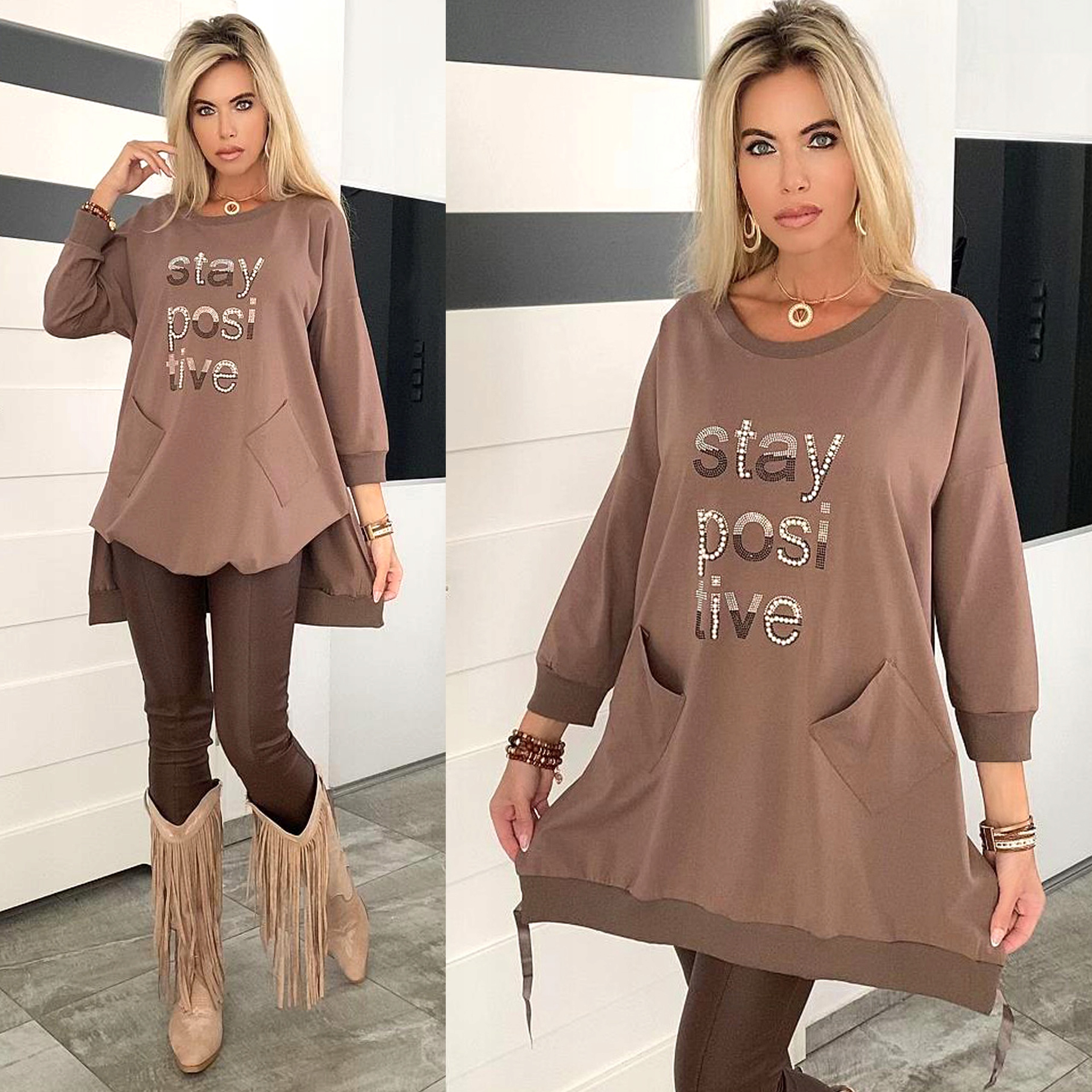Коричнева туніка плюс розмір, бавовна, перли та залишаються позитивними FB100