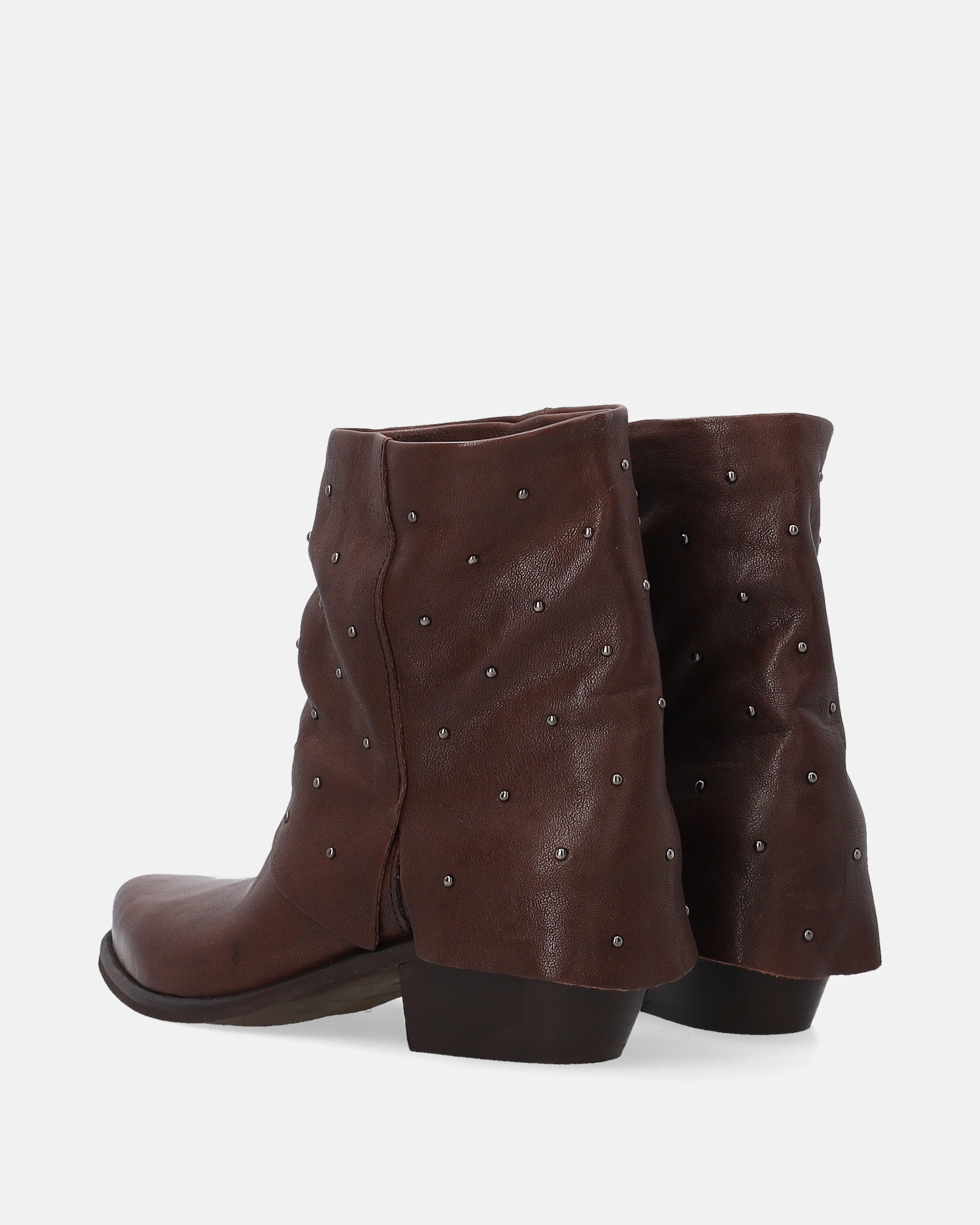 Черевики з м'якої натуральної шкіри чорного кольору з декоративними заклепками. Зібраний, вільно облягаючий верх надає моделі легкості та сучасний характер. Низький стійкий каблук забезпечує комфорт носити щодня.