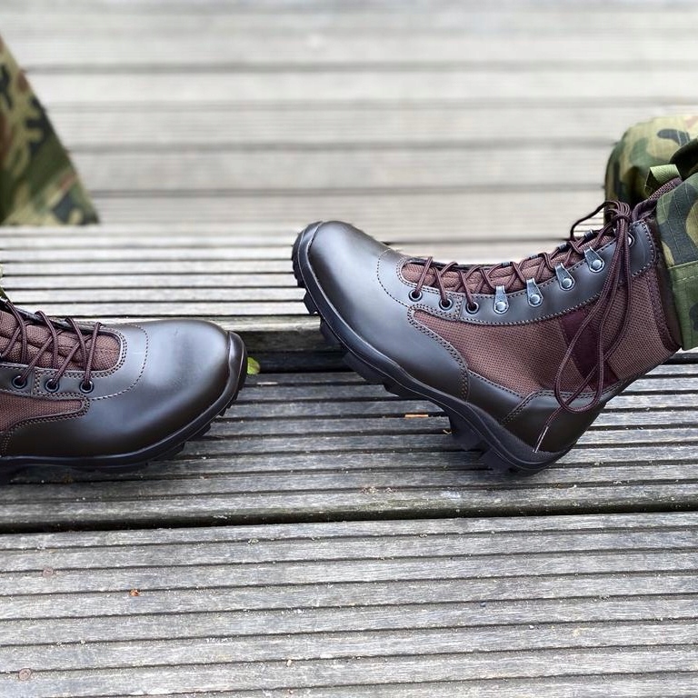 - Тактичні черевики, малюнок 691, виготовлені з коричневої волової шкіри в поєднанні з Cordura з густим характерним переплетенням