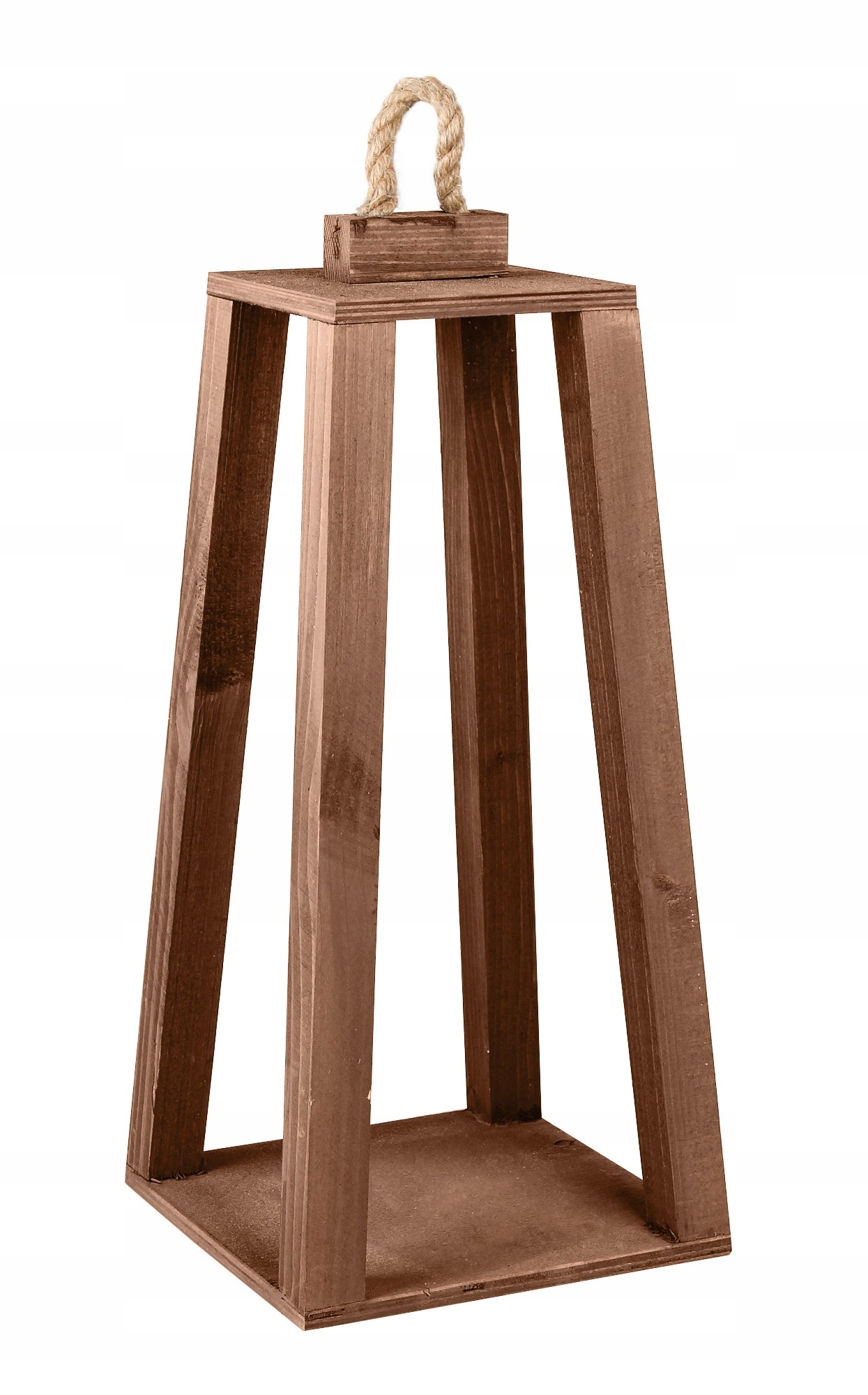ліхтар виготовлений з ялинової деревини та оснащений джутовим тримачем струни, що полегшує його перенесення. Він має 20x20x45 см трапецієподібної форми і пофарбований коричневим. Всередині його можна розмістити штучні або живі квіти, сезонні прикраси, а також свічки - ми особливо рекомендуємо електричні свічки.