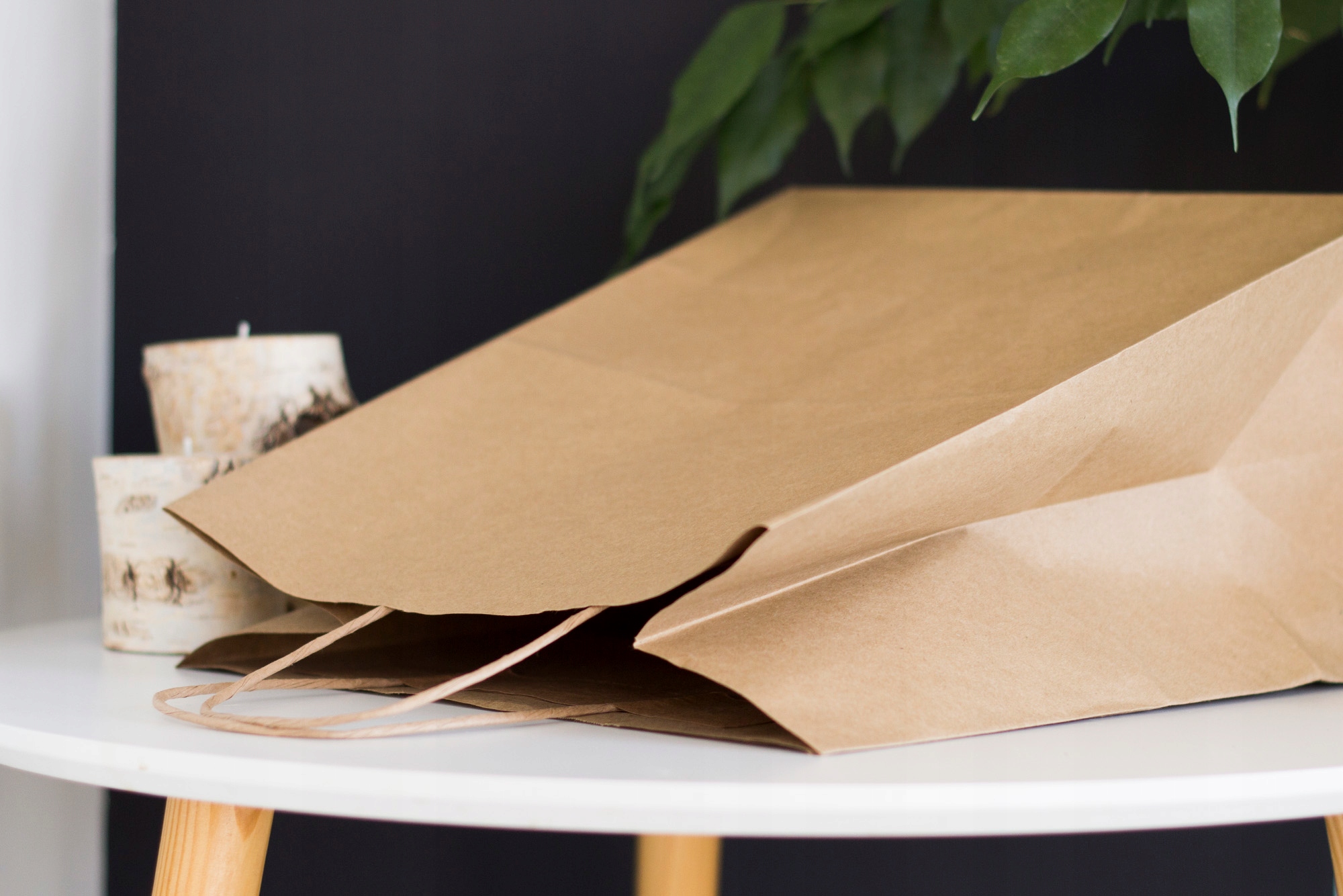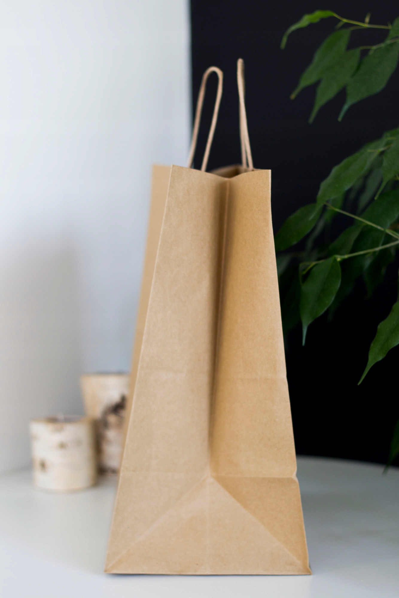 Паперові пакети з плоскими ручками виготовлені з коричневого KRAFT паперу, ручки пакетів вклеєні всередині пакетів.