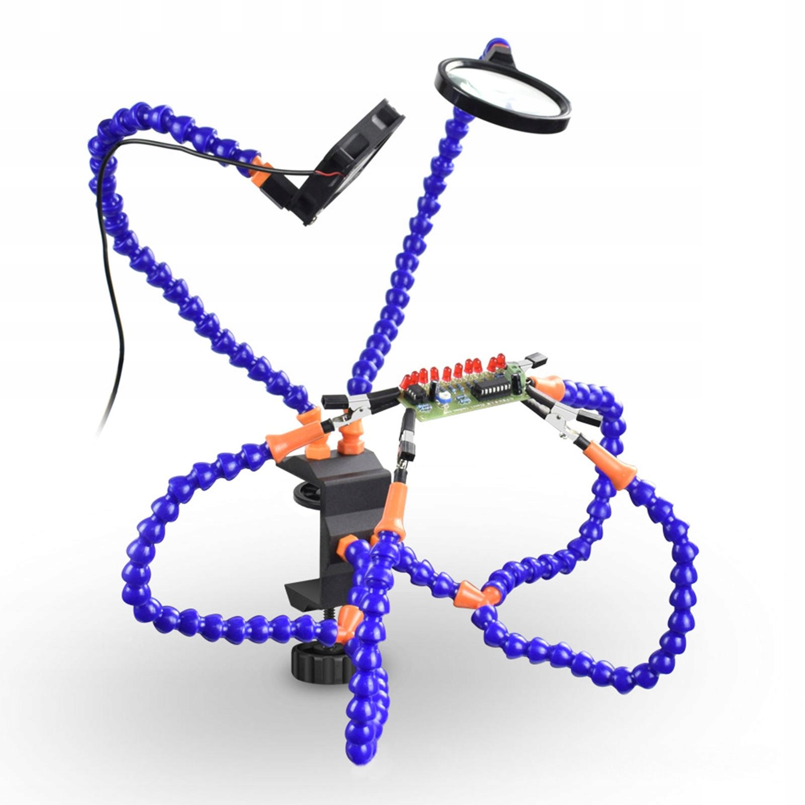 Гнучкі плечі, кожна з крокодилними затискачами, 6 універсальних суглобів, 1 лупа 3x, 1 ліхтарик (параметри), 1 вентилятор USB (параметри), 1 затиск до бази столу, 1 міні -ключових комп'ютерів/ювелірних виробів/ремонту/ремонту/універсального.