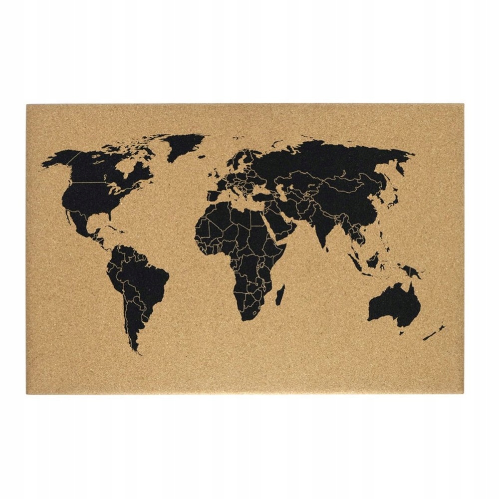 Поверхня з натурального гнучкого пробкового матеріалу, 2 рама товщиною см, легка конструкція на основі дерев’яних смуг, поверхня, стійка до багаторазового вставляння шпильок, друкована карта світу, швидкий і легкий монтаж, монтажний набір і 6 шт. шпильок у комплекті. Розміри: 60 х 40 см