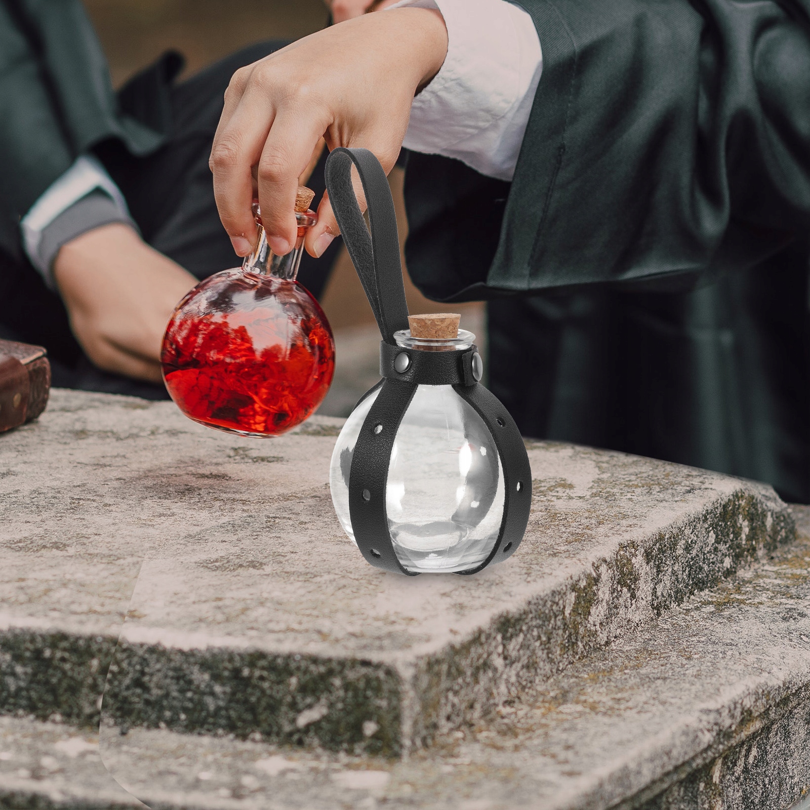 Пробкові пляшки та тримач для пояса зі штучної шкіри — гарна комбінація, яка допоможе додати витонченості костюму відьми чи чарівника.